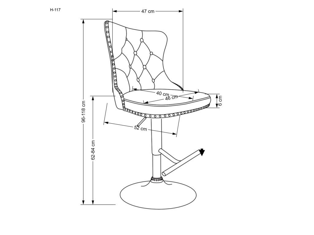 Černá kovová noha s podnožkou zajišťuje vysokou stabilitu a pevnost. Díky plynovému pístu lze snadno nastavit výšku sedu od 62 do 84 cm, což umožňuje přizpůsobení různým výškám stolů či kuchyňských ostrůvků. Nosnost židle je 120 kg.