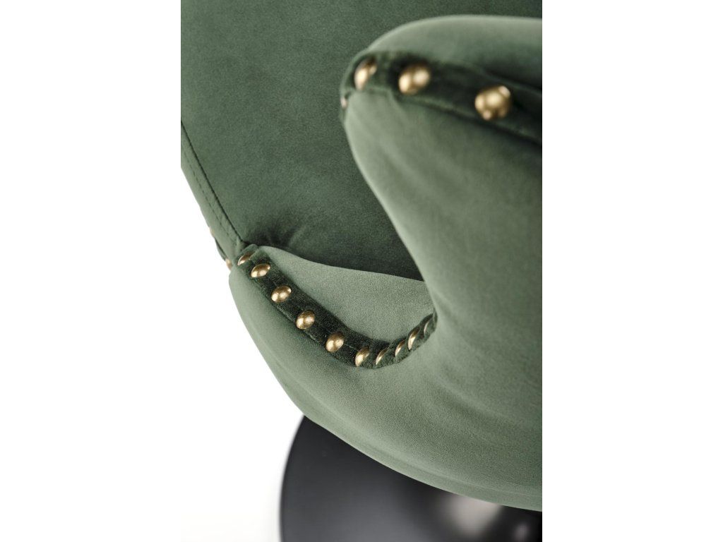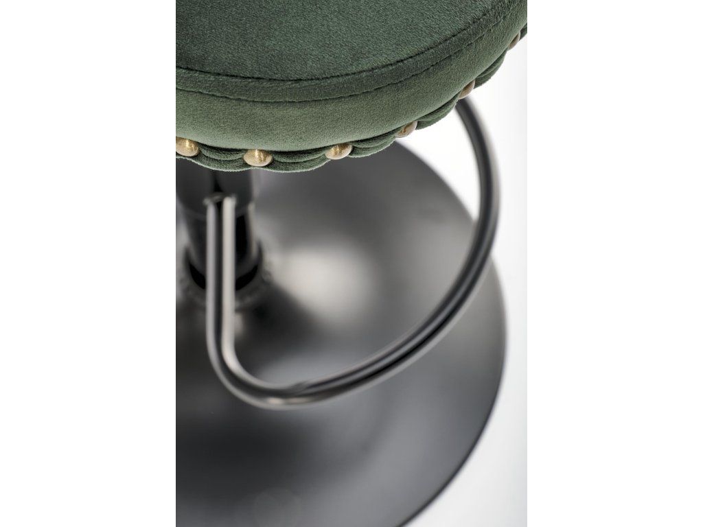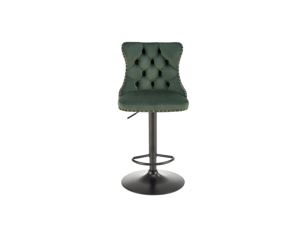 Barová židle VM117 je elegantní kus nábytku, který spojuje pohodlí s moderním glamour designem. Čalounění z tmavě zelené sametové látky s prošívaným opěrákem a ozdobnými starožitnými zlatými nýty dodává židli výrazný charakter a vizuální přitažlivost. Sametová tkanina je nejen na pohled luxusní, ale také velmi příjemná na dotek.