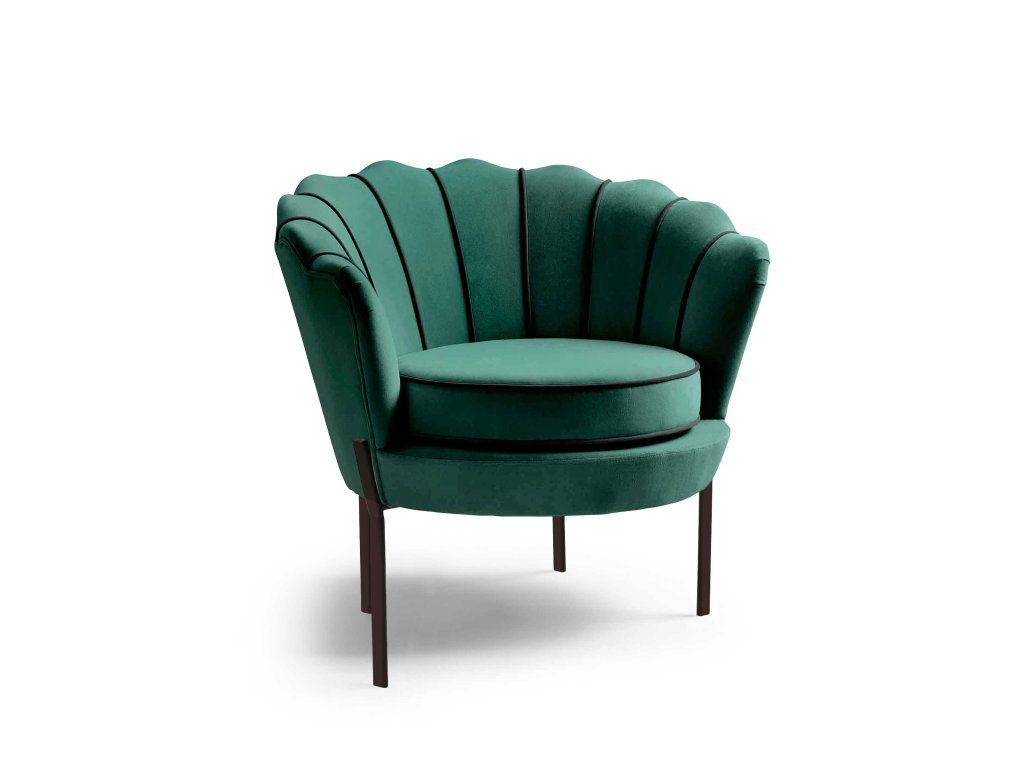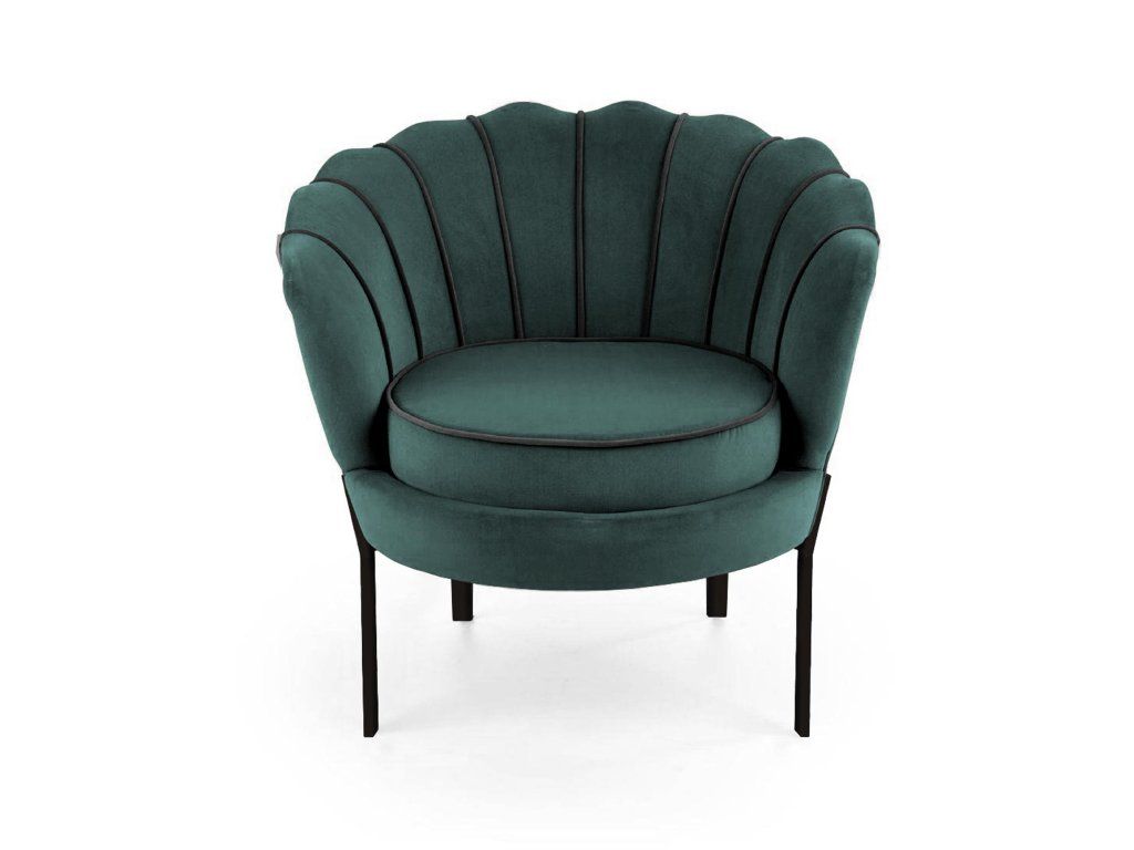 Křeslo MITCHELL v tmavě zelené barvě je výrazným a elegantním doplňkem do každého interiéru, který klade důraz na styl, komfort a osobitost. Jeho tvar inspirovaný skořepinou přitahuje pozornost a stává se dominantou prostoru, ať už jej umístíte do obývacího pokoje, ložnice nebo ke kosmetickému stolku.