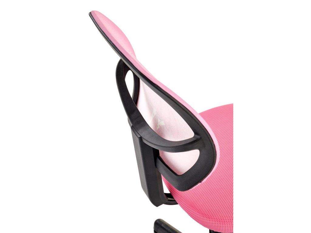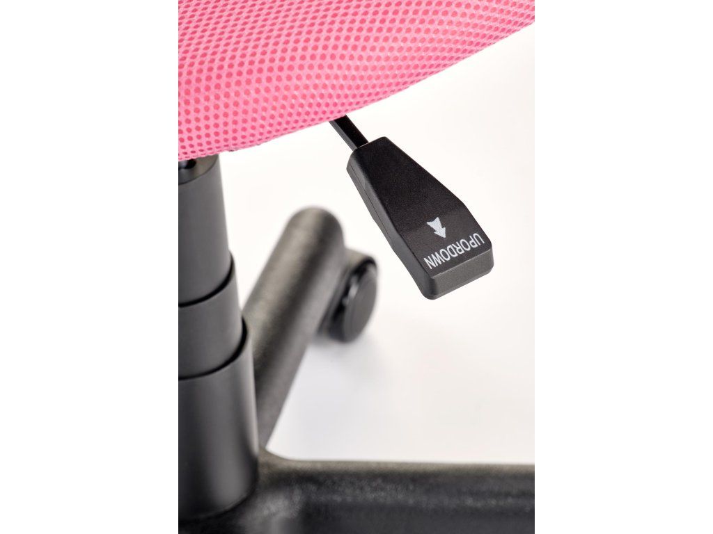 Čalounění z kvalitní růžové textilie je odolné, snadno se čistí a zároveň působí moderně a hravě. Otočný mechanismus umožňuje volný pohyb, což podporuje aktivní sezení. Stabilní konstrukce s nosností až 80 kg zajišťuje bezpečné každodenní používání.