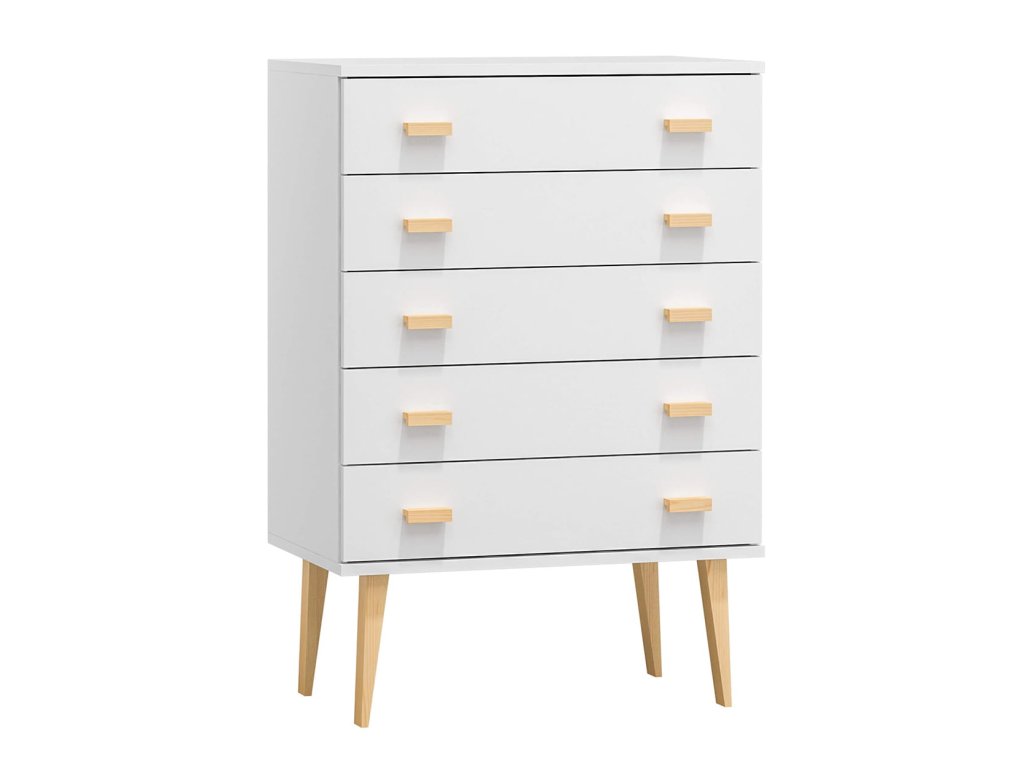 Dřevěná komoda AURUM NORD K15S z masivní borovice kombinuje elegantní design s vysokou funkčností. S pěti prostornými zásuvkami poskytuje ideální řešení pro ukládání oblečení, doplňků nebo domácích drobností. Je vhodná do obývacího pokoje, ložnice i pracovny a přináší do interiéru pocit řádu a harmonického stylu.