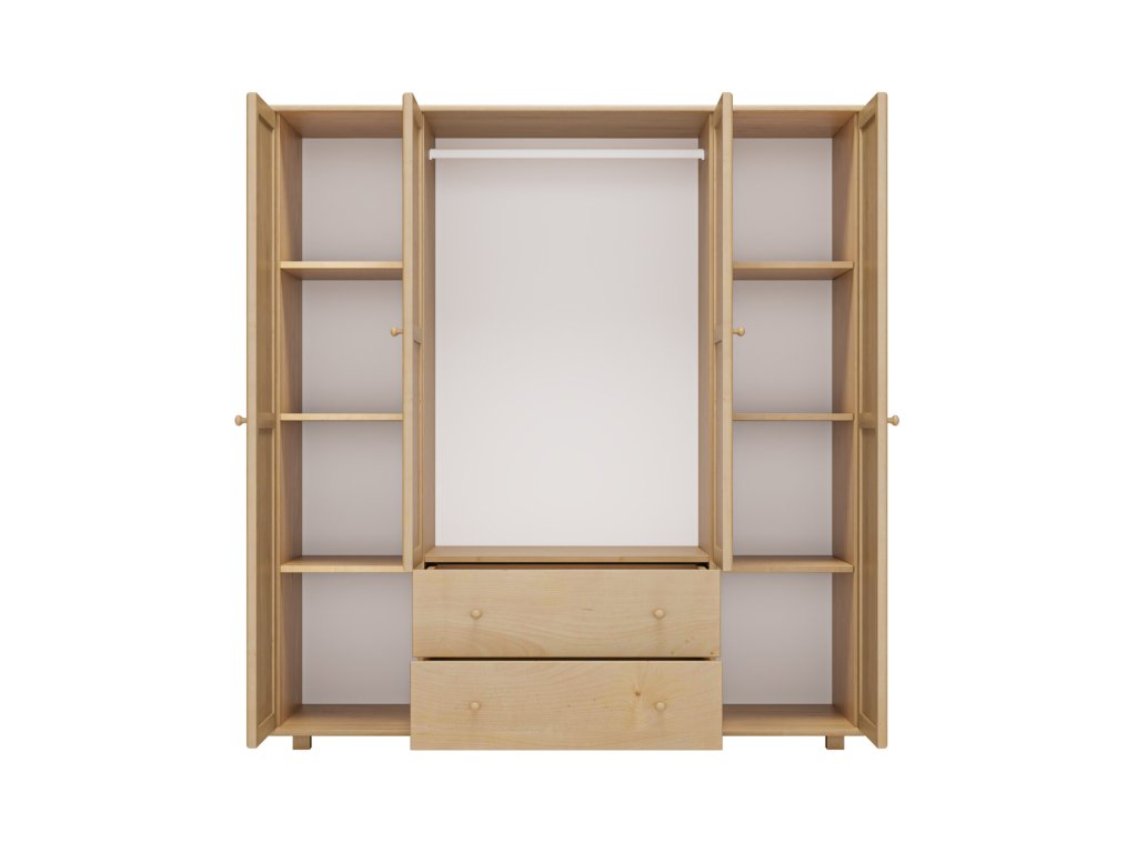 Skříň je vyrobena z masivu borovice první jakosti, což zajišťuje dlouhou životnost, stabilitu a odolnost proti opotřebení. Povrchová úprava je pečlivě provedena s důrazem na detail – dřevo je hladké, příjemné na dotek a zachovává svou přírodní kresbu, která dodává nábytku jedinečný charakter.