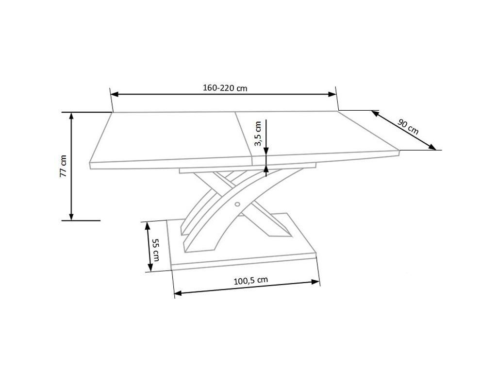 Materiály a design: Stůl má desku vyrobenou z lakovaného MDF a skla, což zaručuje vysoký lesk a snadnou údržbu. Originální noha stolu z lakované MDF a nerezové oceli dodává stolu moderní vzhled a stabilitu. Díky tomu je stůl nejen vizuálně atraktivní, ale i pevný a odolný. Vložená bílá vložka umožňuje prodloužení stolu z původní délky 160 cm na 220 cm, což zajišťuje dostatek prostoru pro větší počet hostů.