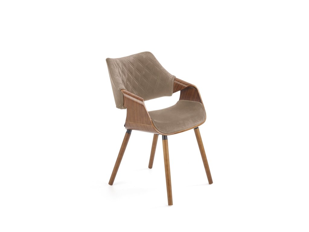 Rám sedáku je vyroben z tvarované překližky v přírodním ořechovém odstínu a tvoří i praktické integrované područky pro větší pohodlí. Sedák a opěradlo jsou čalouněny jemnou béžovou sametovou látkou, která je měkká na dotek a pod světlem vytváří elegantní, jemně lesklý efekt. Decentní prošívání na opěradle podtrhuje její stylový vzhled.
