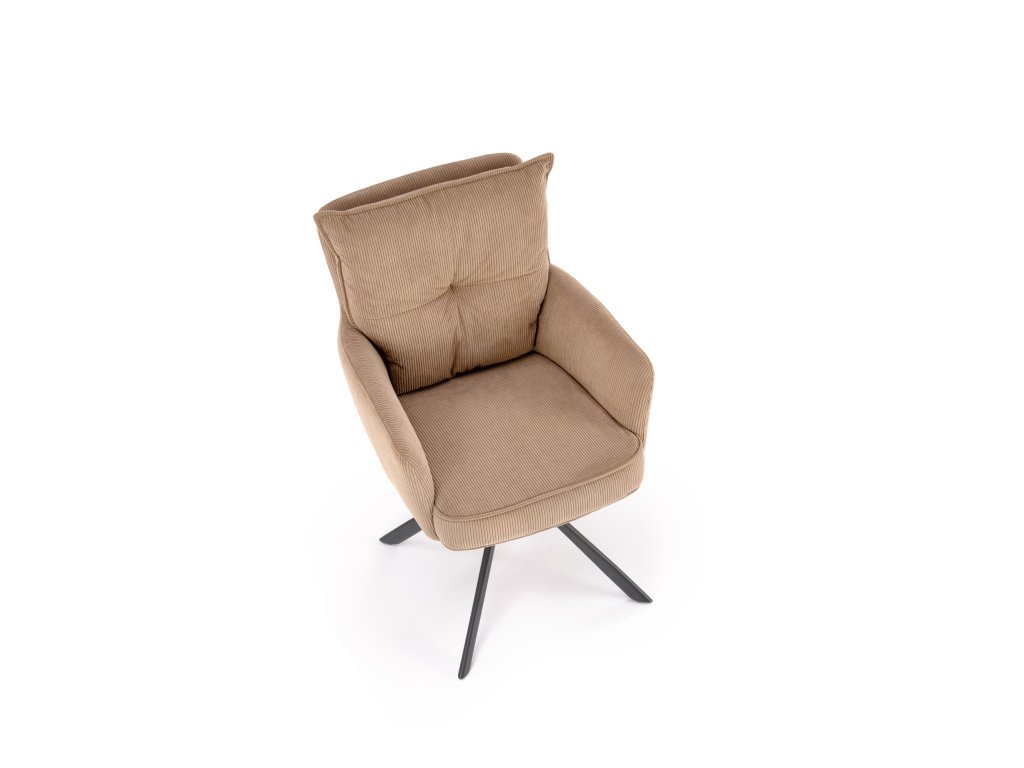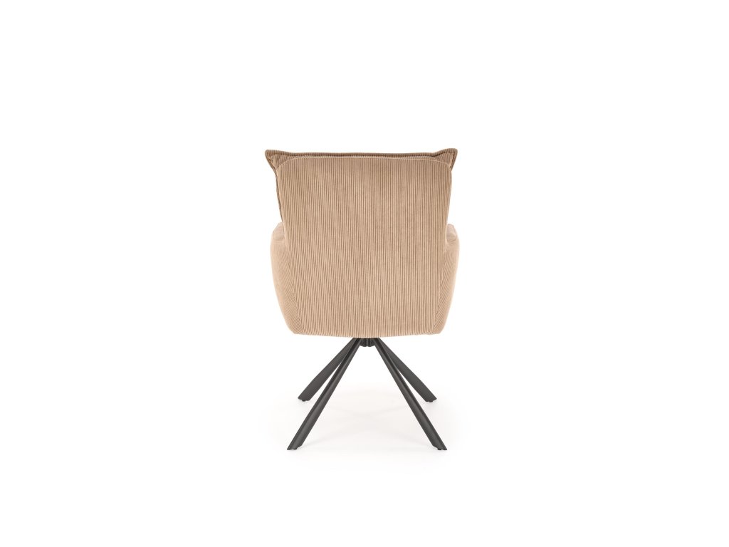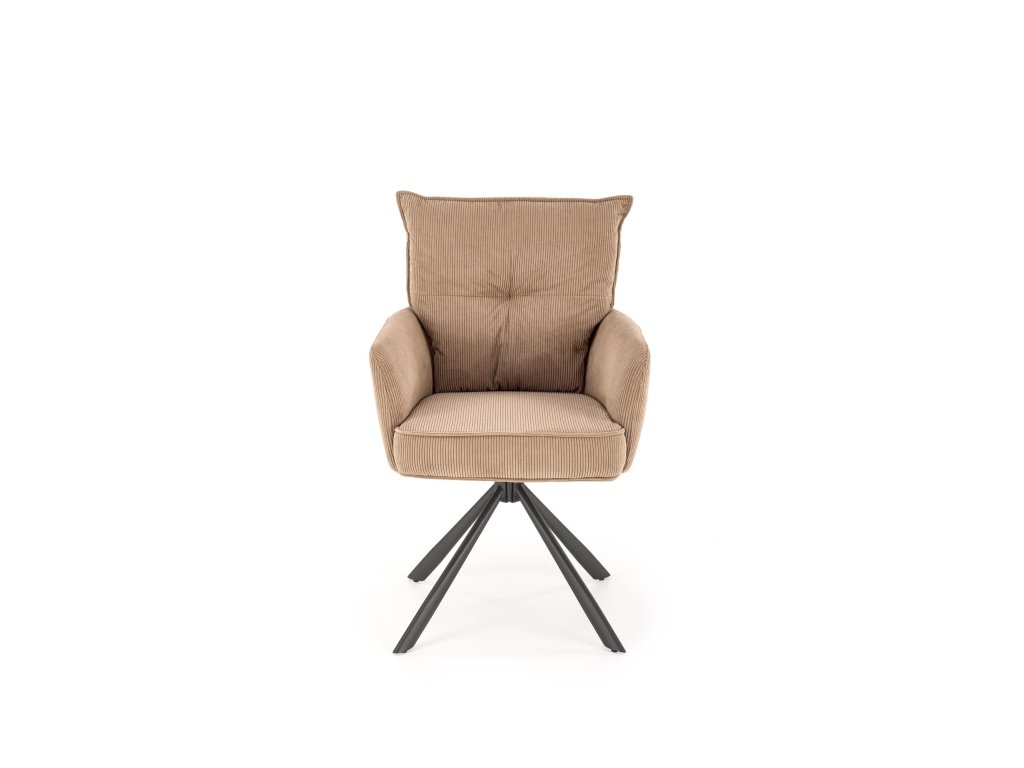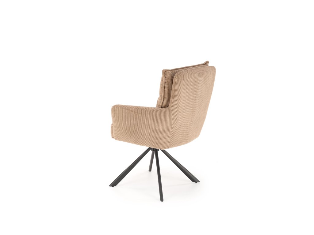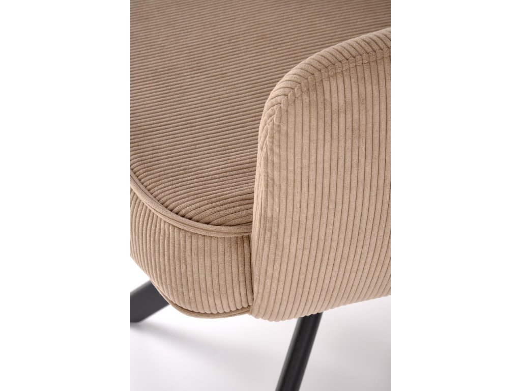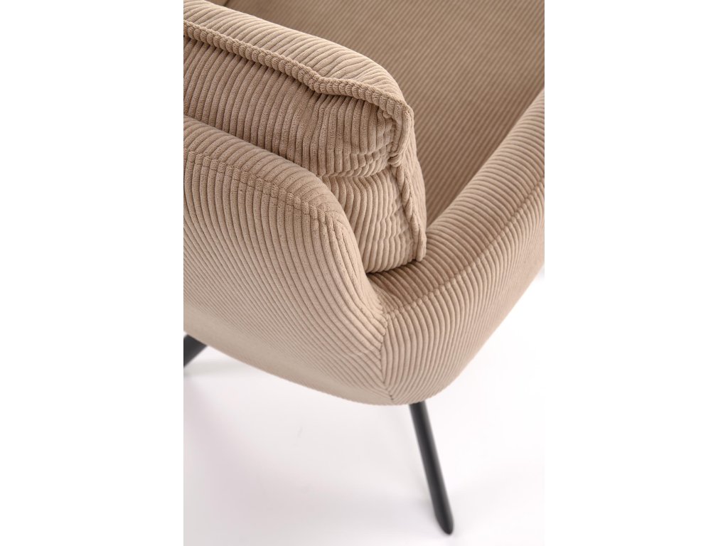 Povrch křesla je potažen příjemnou manšestrovou tkaninou, která je nejen vizuálně atraktivní, ale i měkká na dotek a snadná na údržbu. Stabilní ocelová podnož s práškovým nástřikem zajišťuje pevnost konstrukce, přičemž celková nosnost křesla je 100 kg.