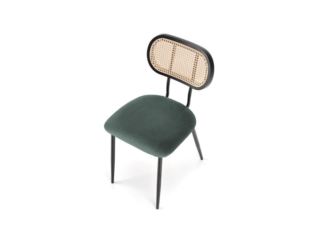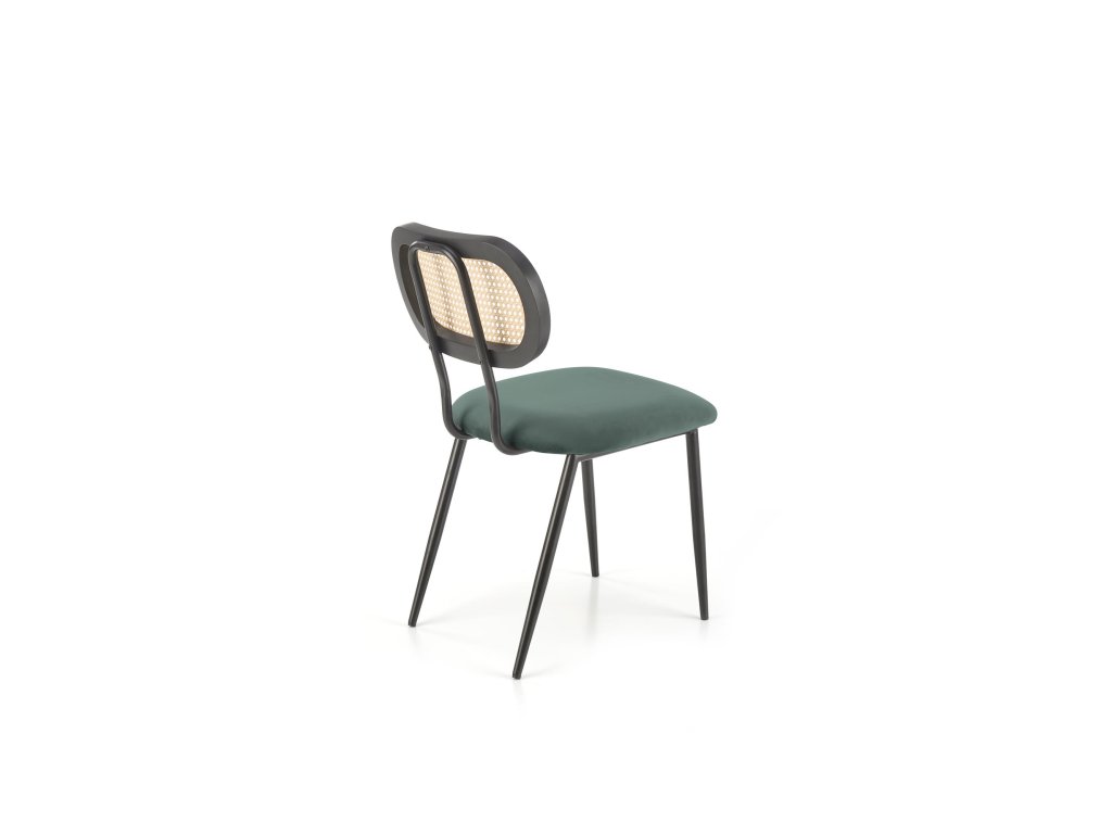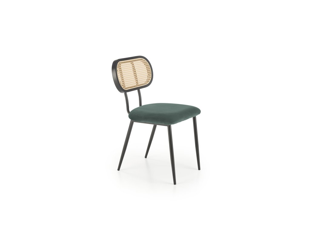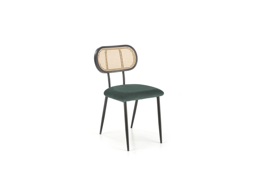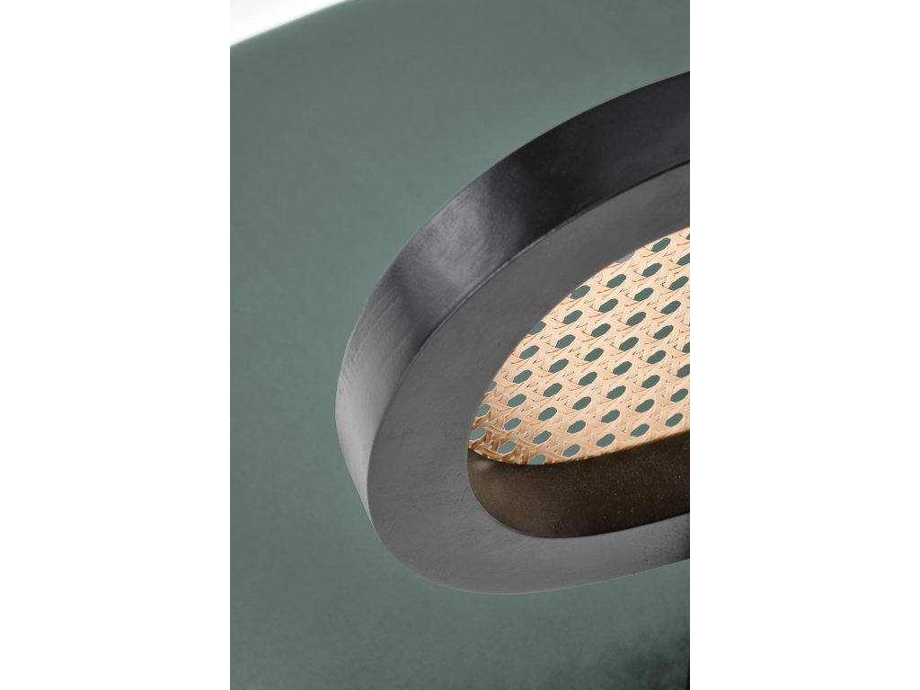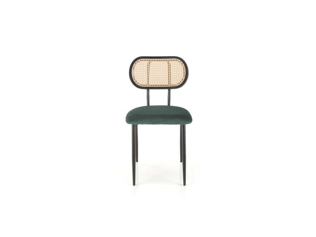 Jídelní židle VMK503 v tmavě zelené barvě je kombinací jedinečného designu a kvalitních materiálů. Opěrák z technoratanu v podobě vídeňského výpletu je zasazen do zaobleného rámu z masivního kaučukového dřeva, lakovaného na černo. Tato kombinace přírodních a moderních materiálů dodává židli nadčasový vzhled, který osloví i ty nejnáročnější. Sedák potažený tmavě zelenou sametovou látkou se jemně leskne na světle, což přidává nábytku nádech elegance.