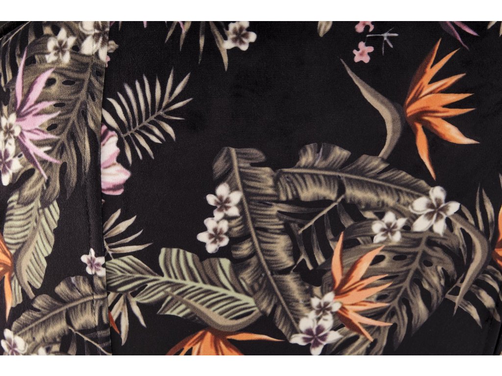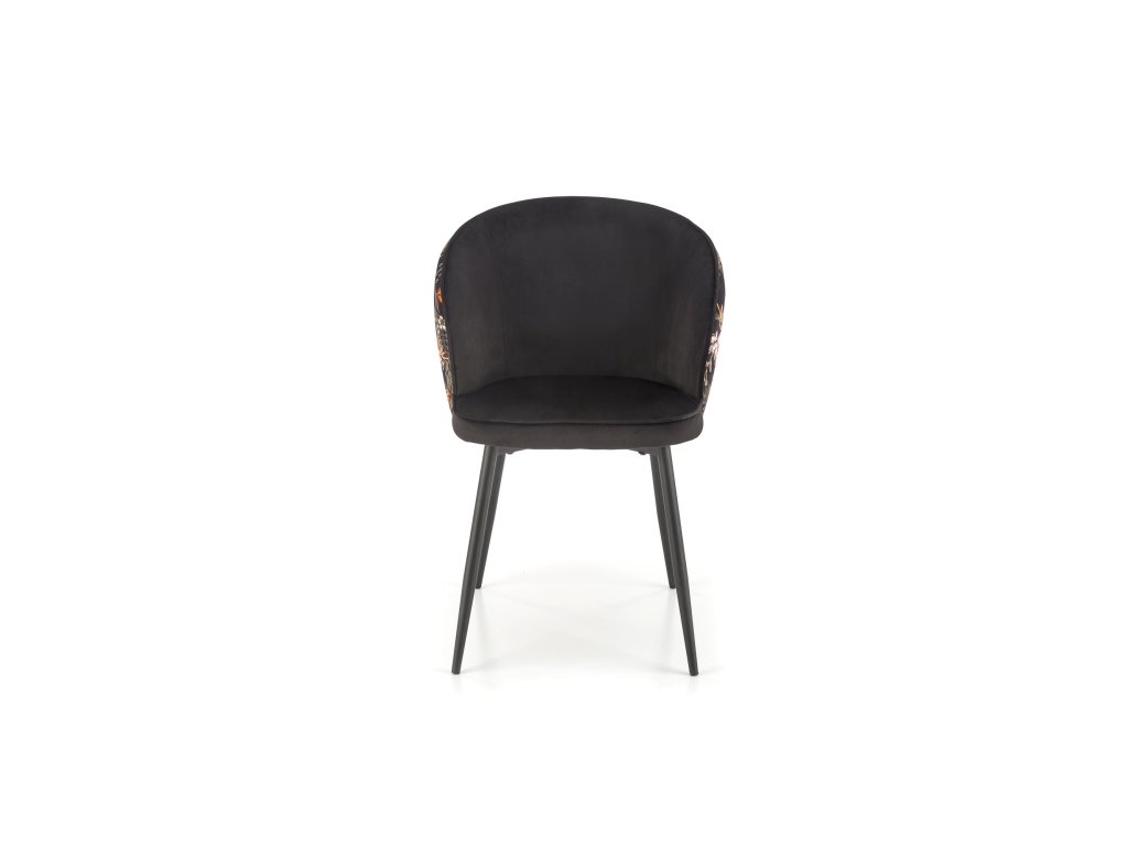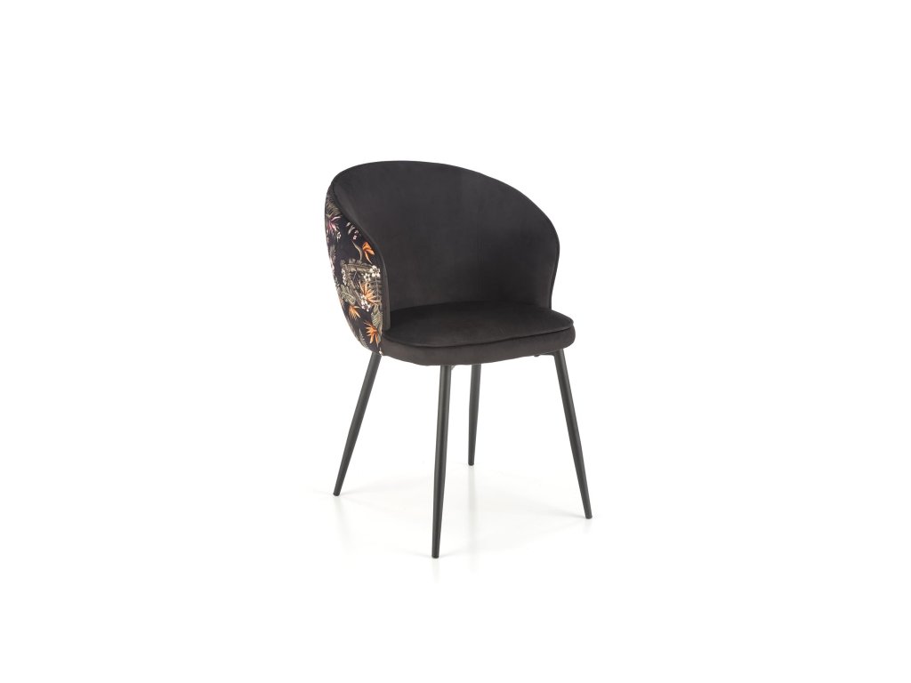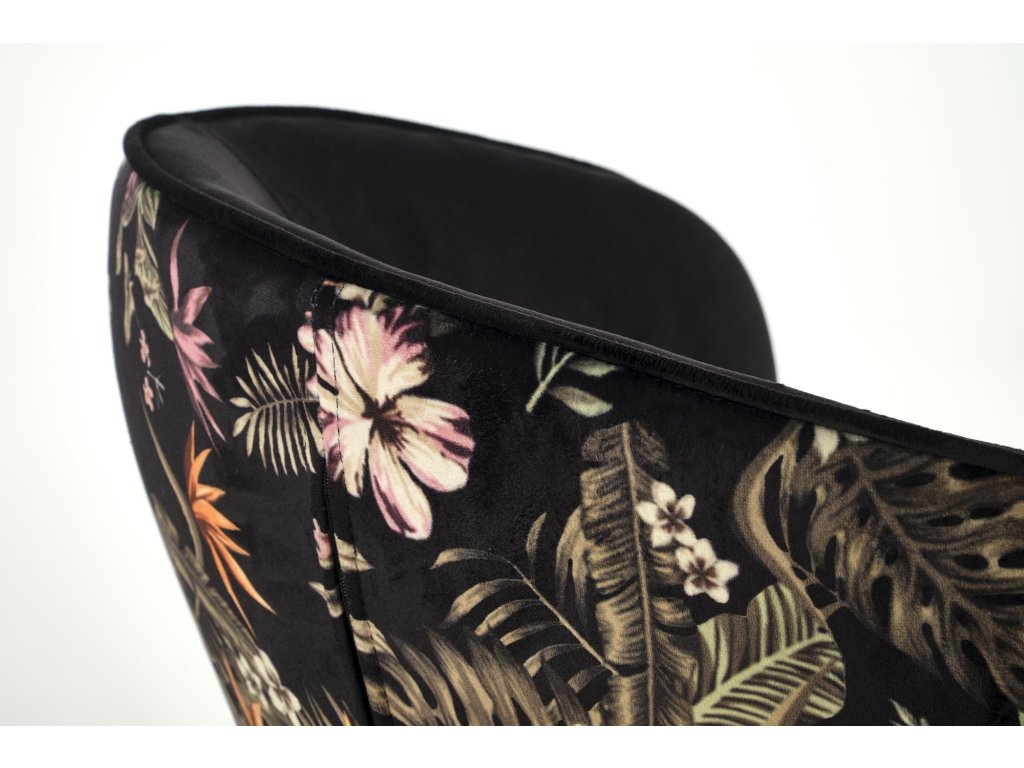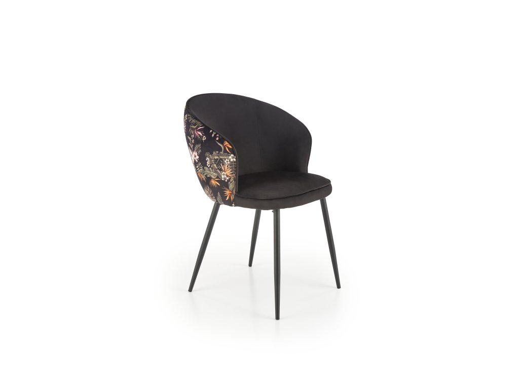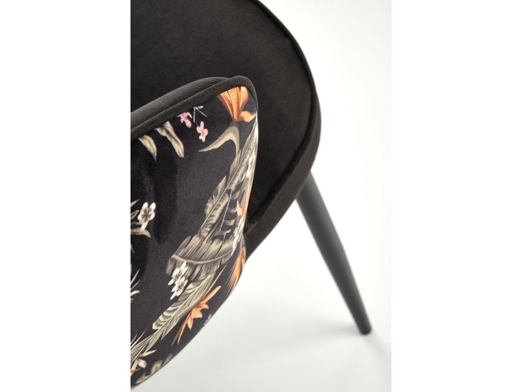 Židle VMK506 zaujme svou kombinací industriálních akcentů, včetně černých ocelových nohou s práškovým nástřikem, které dodávají nábytku robustní vzhled. Černé sametové čalounění sedáku přináší do prostoru nádech rafinovanosti, zatímco vzorovaná látka s jemnými rostlinnými motivy na opěradle přidává nádech elegance. Tento design spojuje moderní a nadčasové prvky, které snadno zapadnou do různých stylů interiérů.
