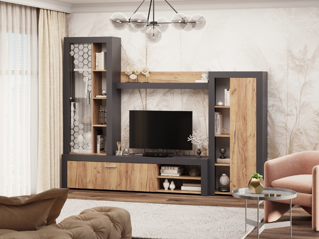 - Prostor pro vše, co potřebujete: Věšák na televizi, úložné prostory a místo pro dekorace – vše, co je potřeba k dokonalé organizaci obývacího pokoje.