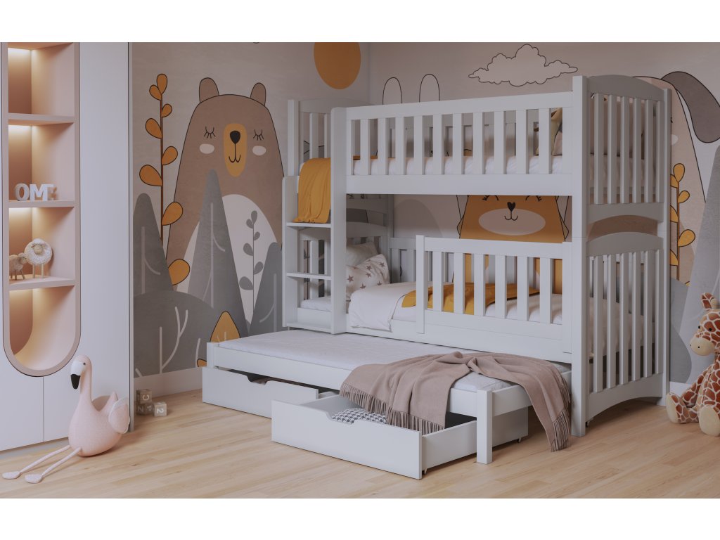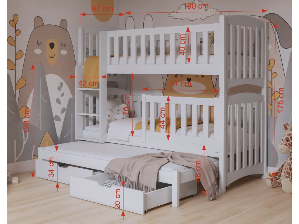 Postel je dodávána bez matrací. Matrace lze snadno objednat samostatně, aby odpovídaly vašim potřebám a požadavkům na pohodlí. Ideální velikost pro tři osoby do menších prostor. Minimalistický design, který skvěle doplní různé styly interiéru. Snadná údržba díky kvalitní povrchové úpravě. Postel je perfektní volbou pro ty, kteří hledají kombinaci praktičnosti a estetiky. Přizpůsobte si ji barevně svému vkusu a vytvořte si místo, kde se budete cítit příjemně a odpočatě.