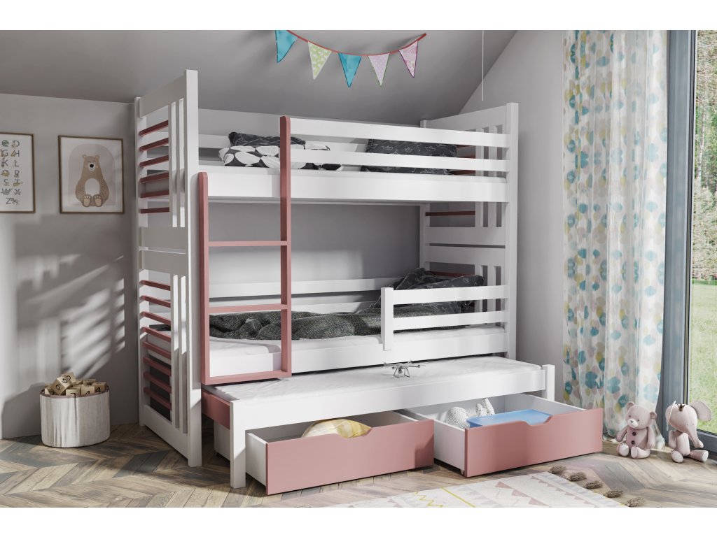 Postel je dodávána bez matrací. Matrace lze snadno objednat samostatně, aby odpovídaly vašim potřebám a požadavkům na pohodlí. Ideální velikost pro tři osoby do menších prostor. Minimalistický design, který skvěle doplní různé styly interiéru. Snadná údržba díky kvalitní povrchové úpravě. Postel je perfektní volbou pro ty, kteří hledají kombinaci praktičnosti a estetiky. Přizpůsobte si ji barevně svému vkusu a vytvořte si místo, kde se budete cítit příjemně a odpočatě.