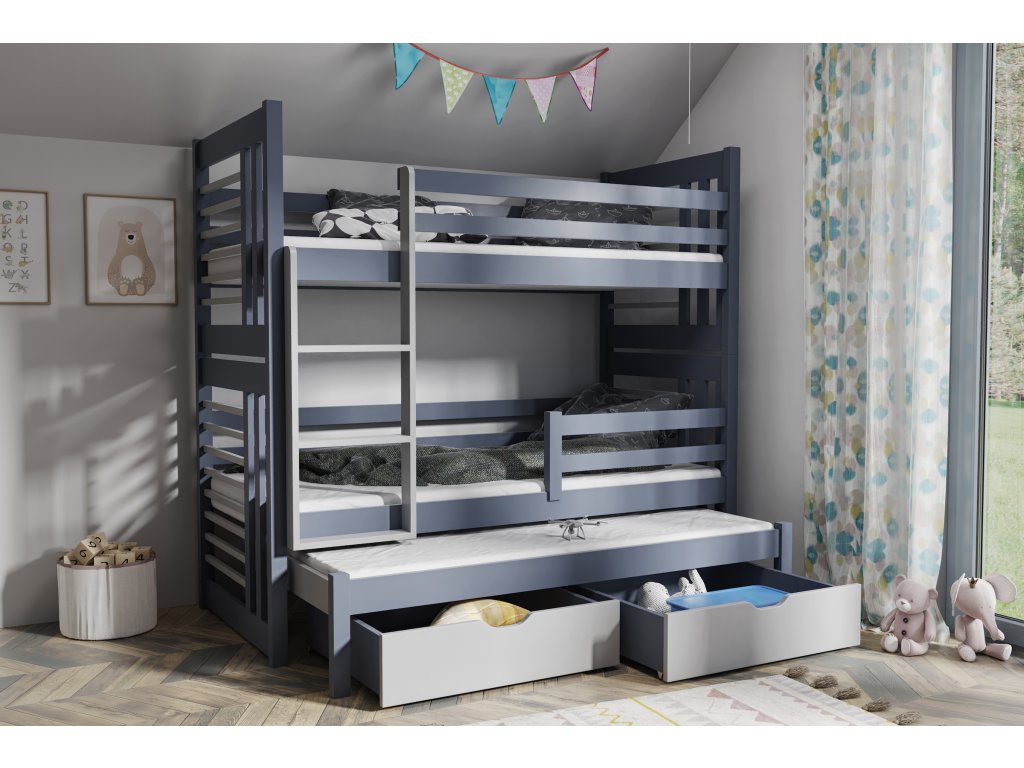 Patrová postel s přistýlkou NUBO, 80 x 200 cm, barva bílá + grafit + ROŠTY a ZÁSUVKY v ceně