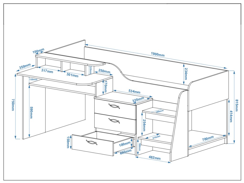 Dětská zvýšená postel SPEYS 190x70 cm je ideálním řešením pro efektivní využití prostoru v dětském pokoji. Tato praktická patrová postel s výsuvným psacím stolem, zásuvkovou komodou a skříňkou v jednom je navržena tak, aby poskytla dostatek úložného prostoru a zároveň nabízela pohodlné místo pro spánek.