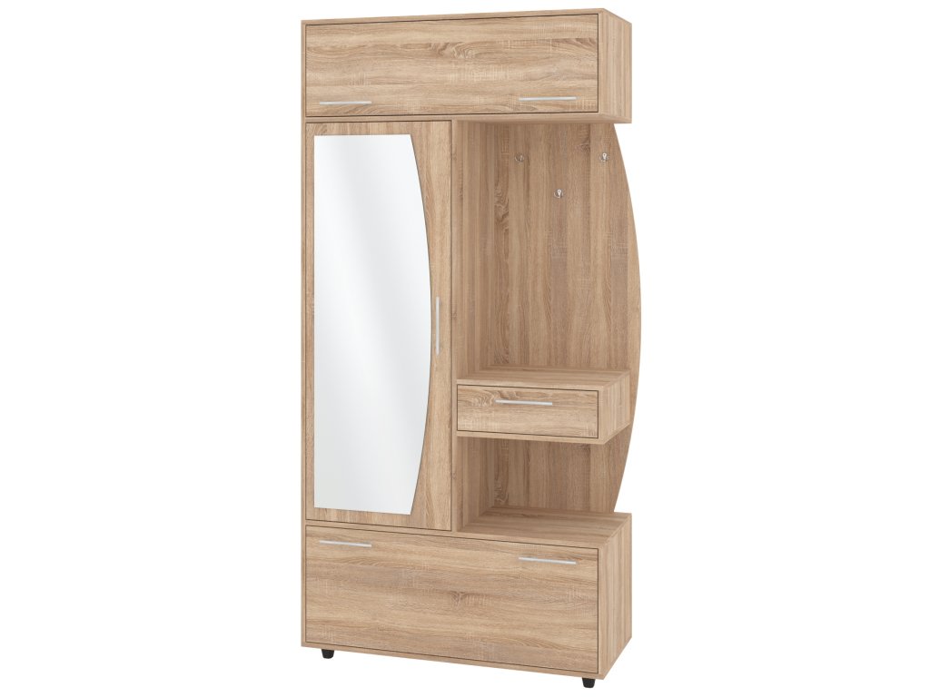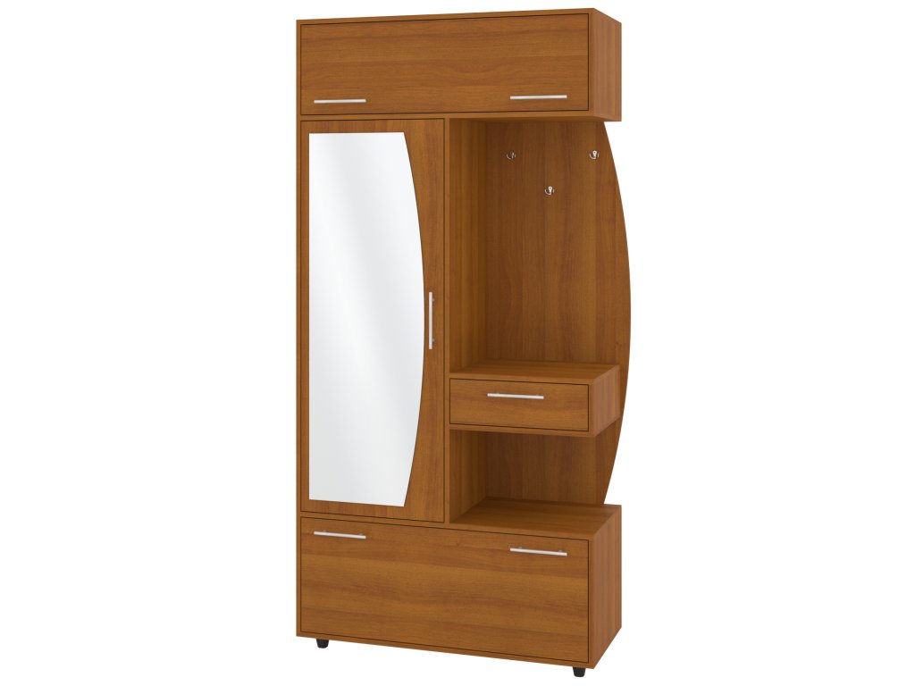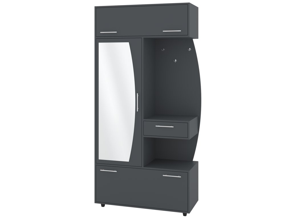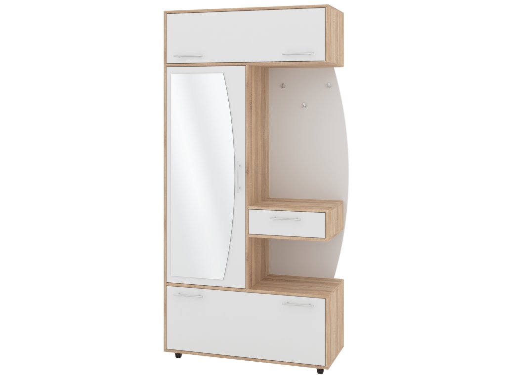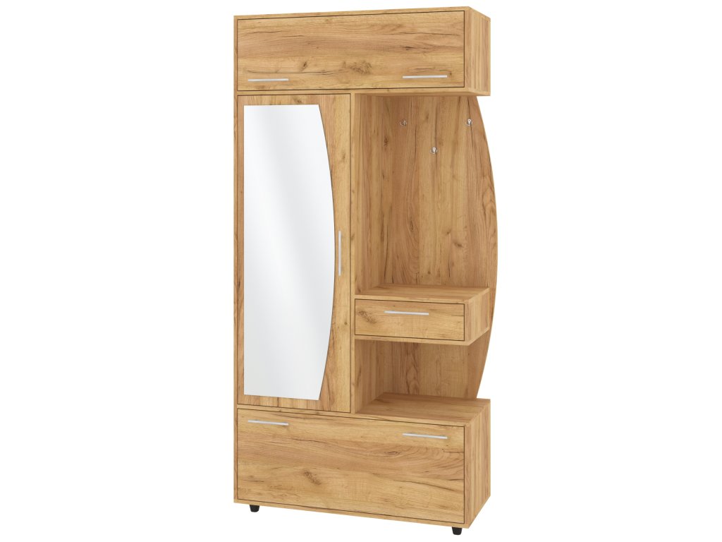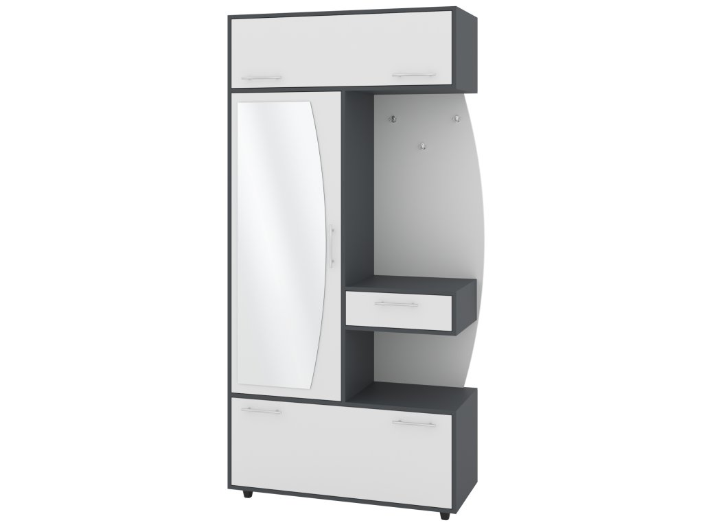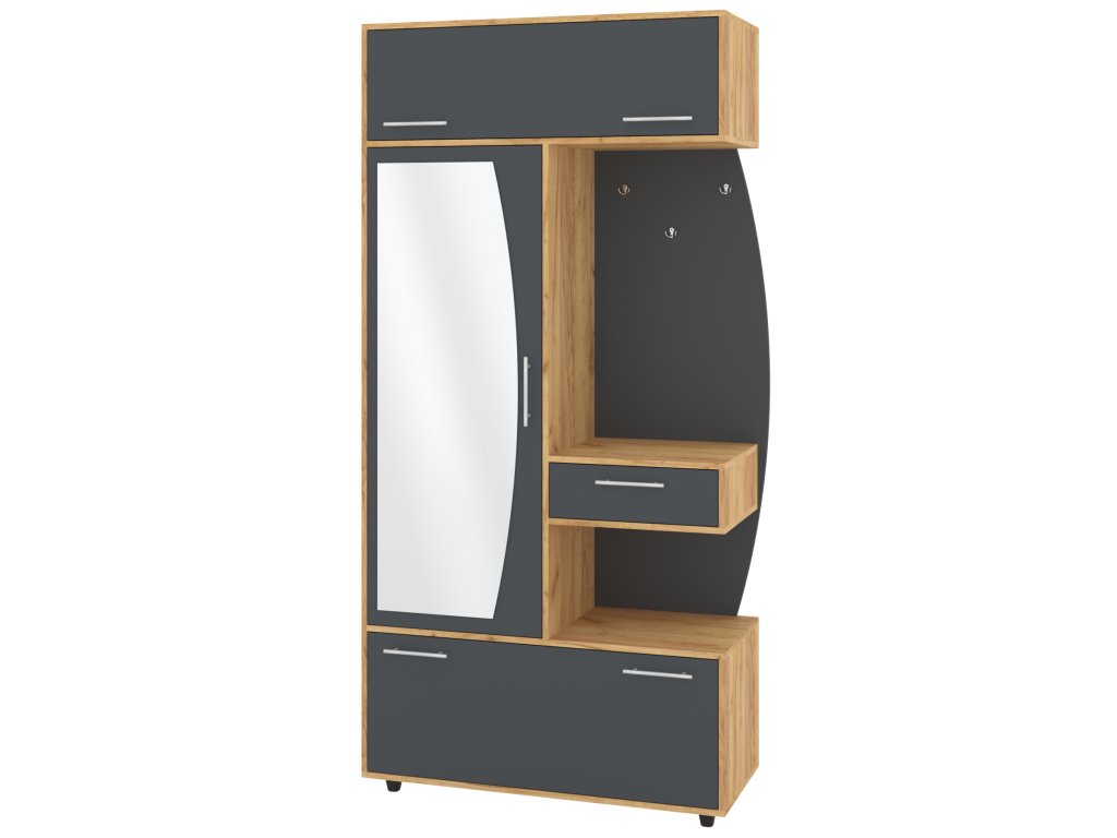 - Komplexní úložný prostor: Věšák, zásuvka, výklopný botník s policemi a šatní skříň s tyčí pro optimální využití každého centimetru předsíně.