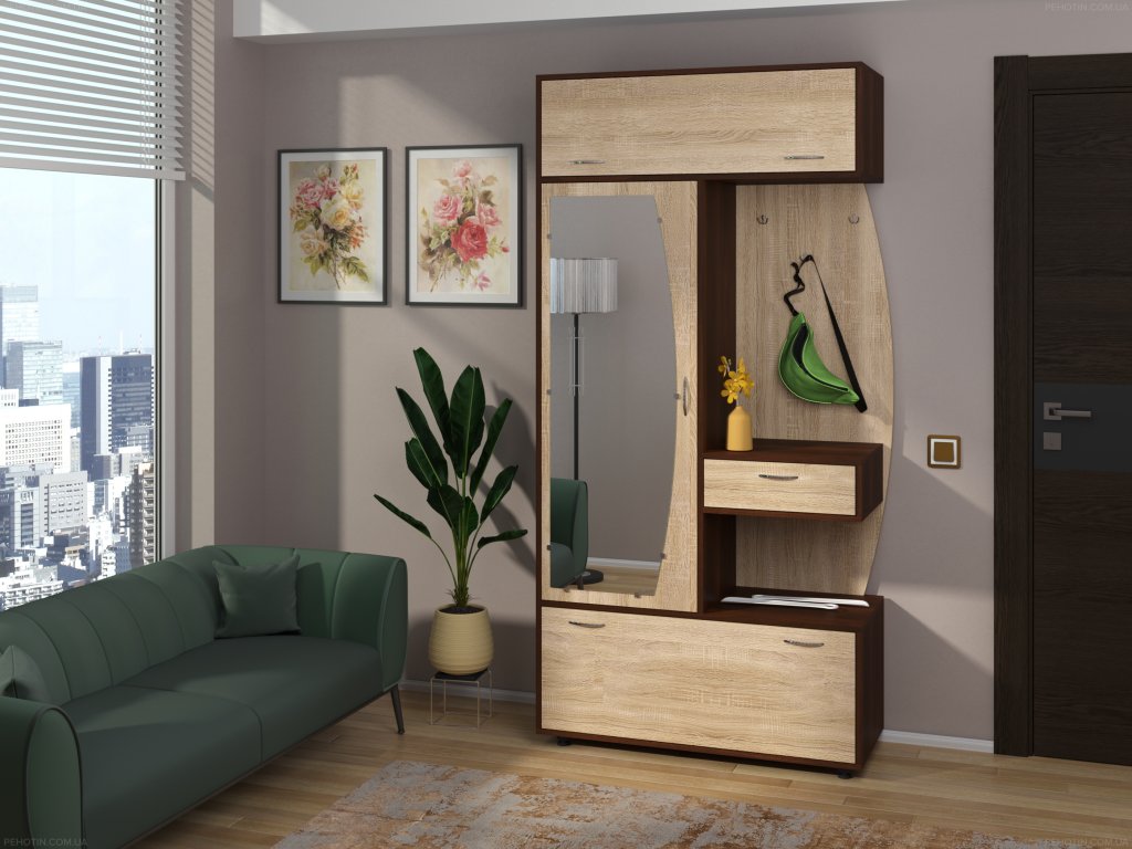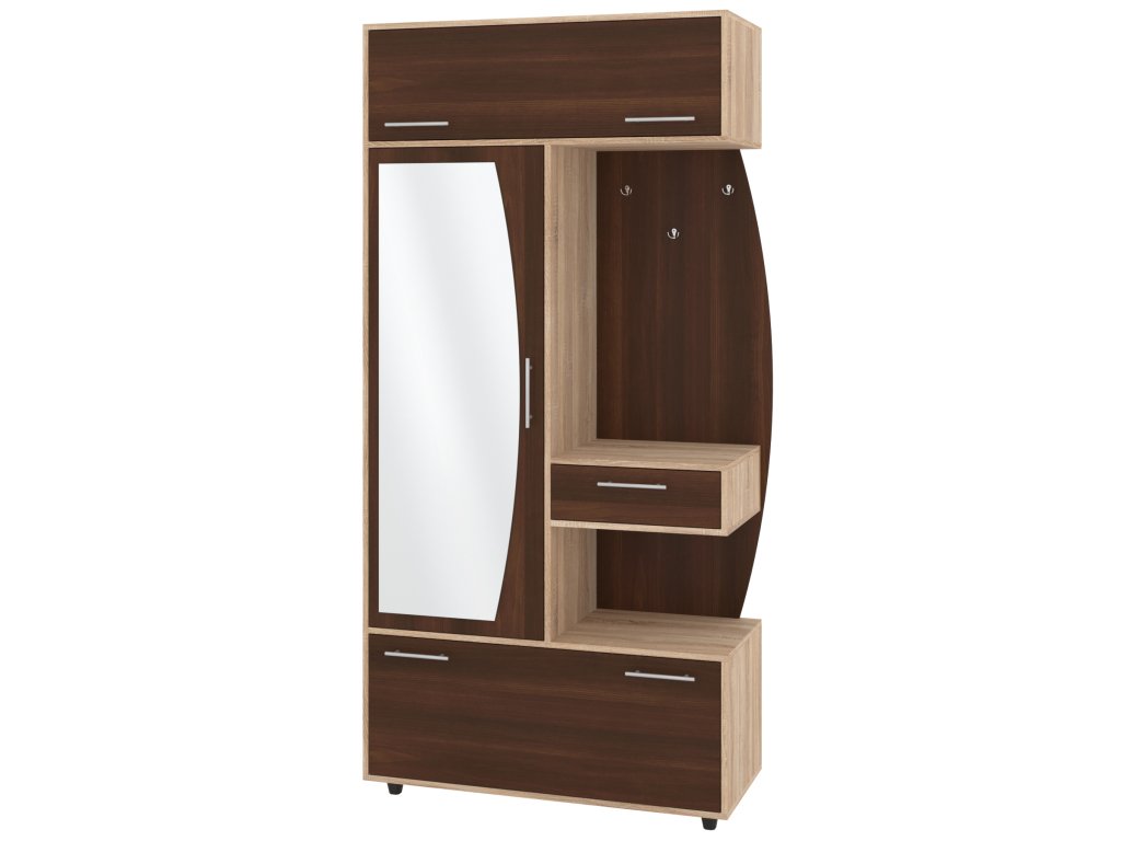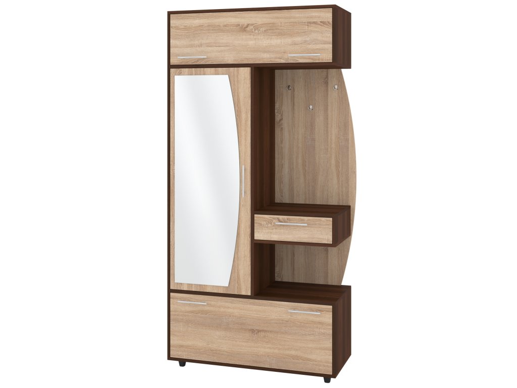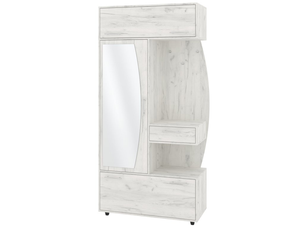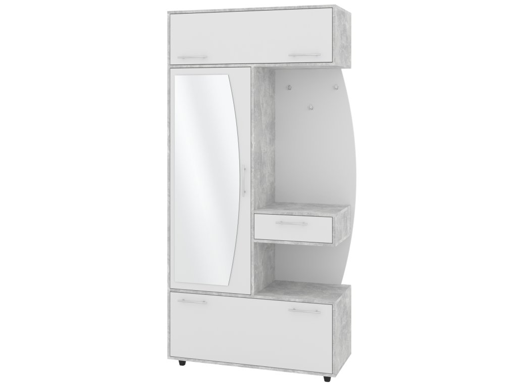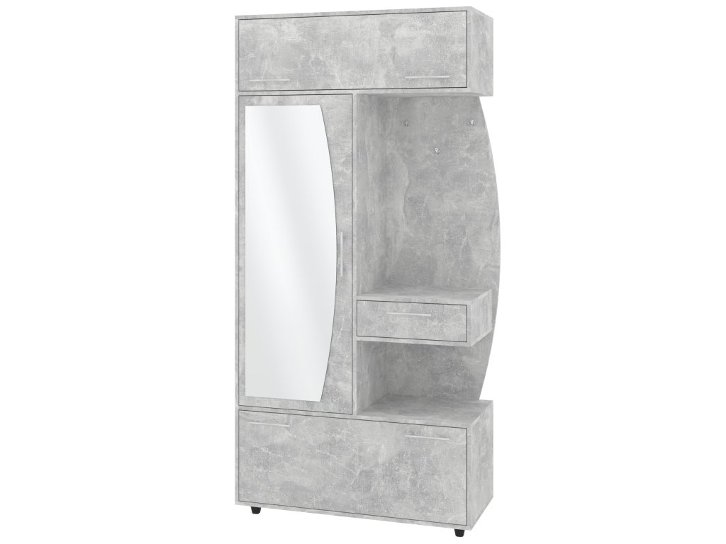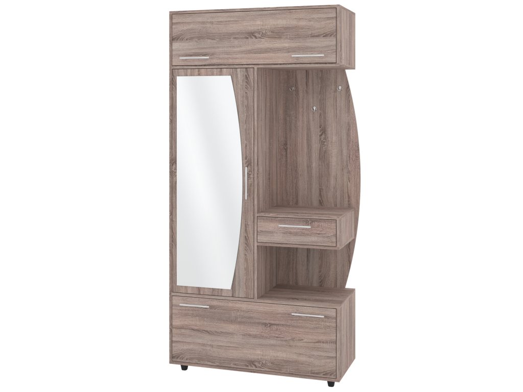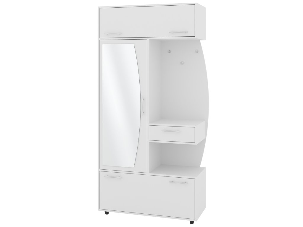 - Komplexní úložný prostor: Věšák, zásuvka, výklopný botník s policemi a šatní skříň s tyčí pro optimální využití každého centimetru předsíně.