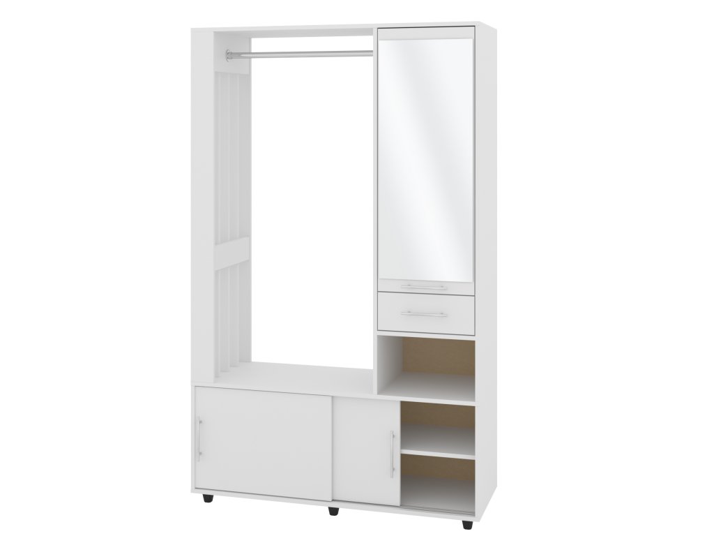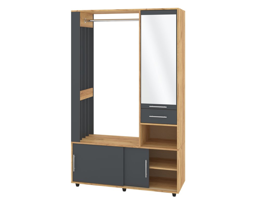 - Praktické uspořádání: Šatní tyč pro zavěšení kabátů a bund, botník s posuvnými dvířky pro úhledné uložení obuvi a zásuvka pro drobnosti.