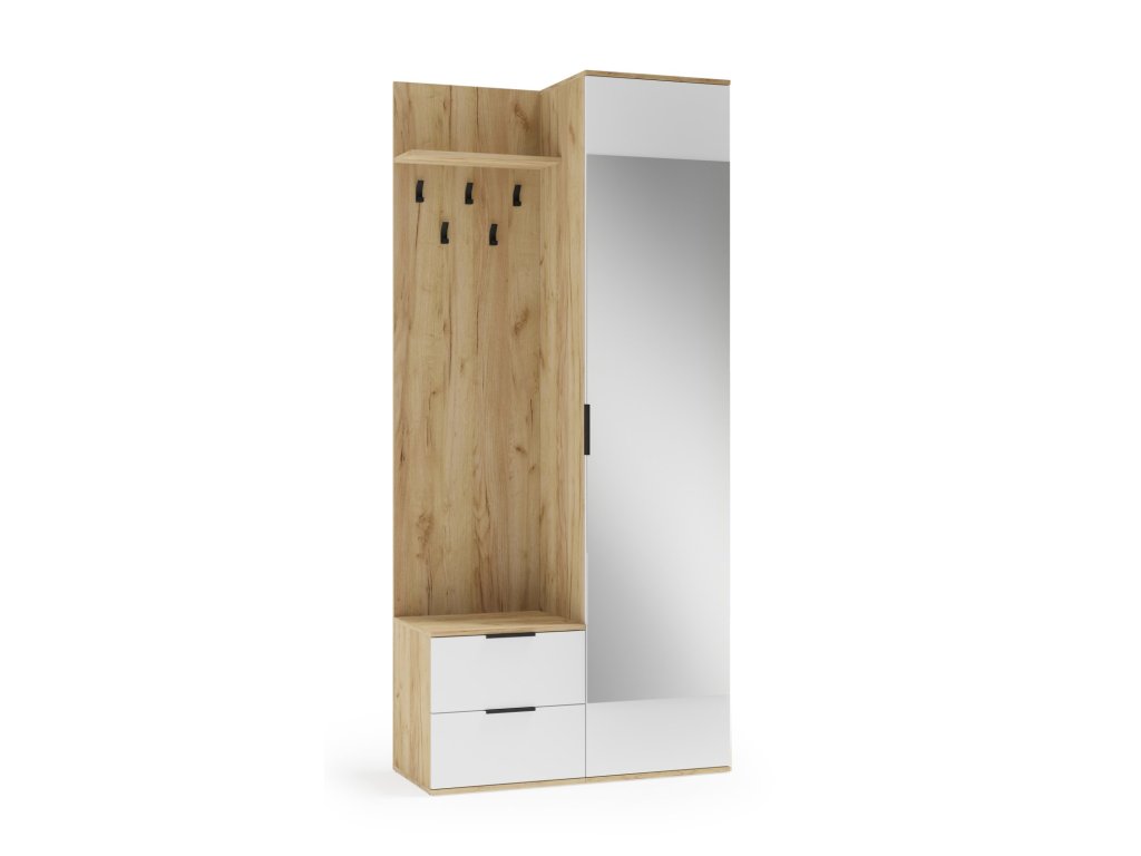Tato předsíňová stěna nabízí maximální úložný prostor – šatní prostor pro kabáty, police na boty i praktické háčky pro klíče či doplňky. Integrované zrcadlo je nejen stylové, ale i funkční – umožňuje rychlou kontrolu vzhledu při odchodu z domu.