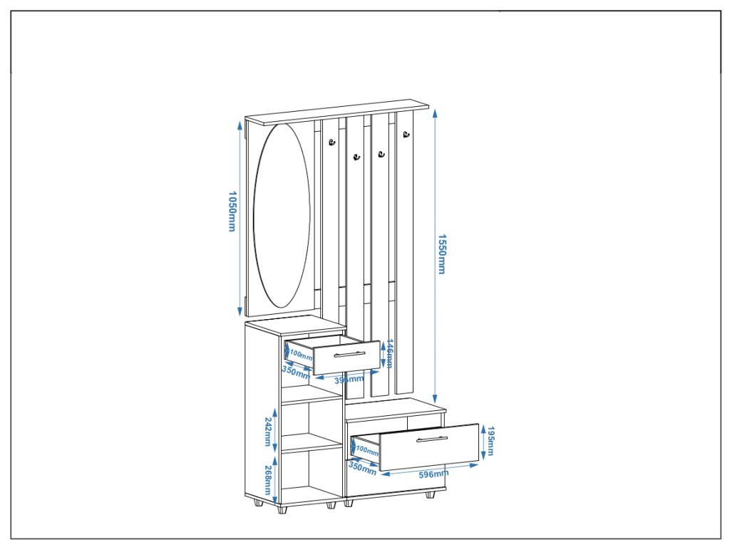 - Praktický úložný prostor: S vestavěným věšákem, zásuvkami a botníkem s dvířky máte vše po ruce a vždy v pořádku.