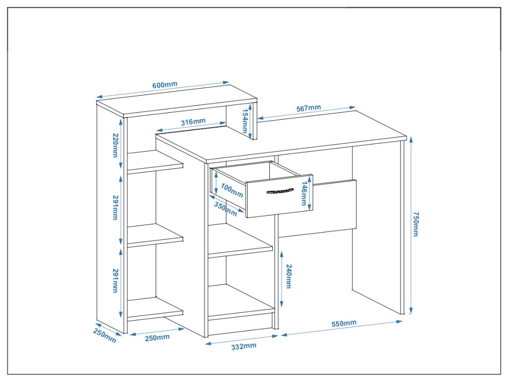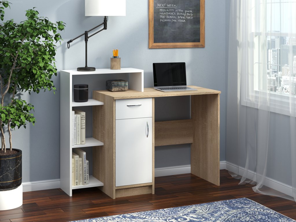 - Praktický regál: Umožňuje efektivní organizaci věcí a udržení pracovního stolu v pořádku.