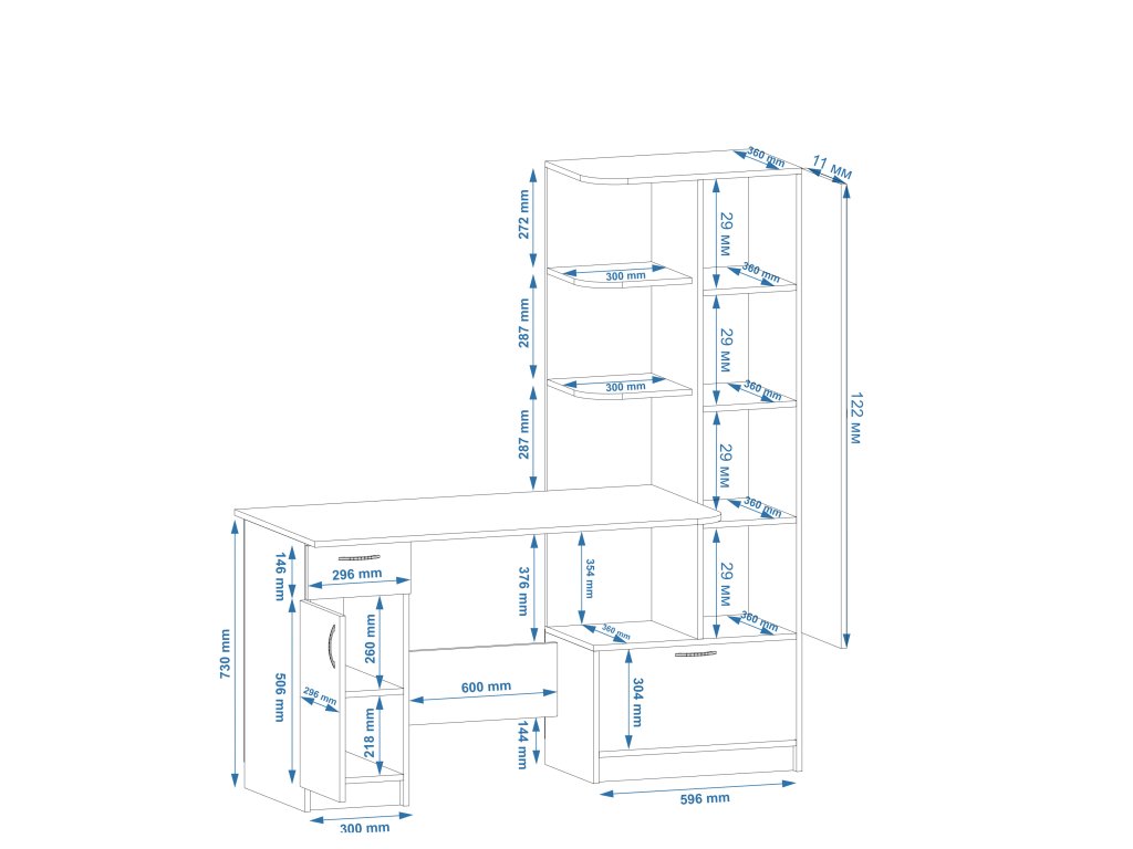 Prostor pro práci i úložný prostor: Stůl s integrovaným regálem a skříní nabízí dostatek místa pro vaši pracovní plochu a zároveň pomůže organizovat vaše kancelářské potřeby.