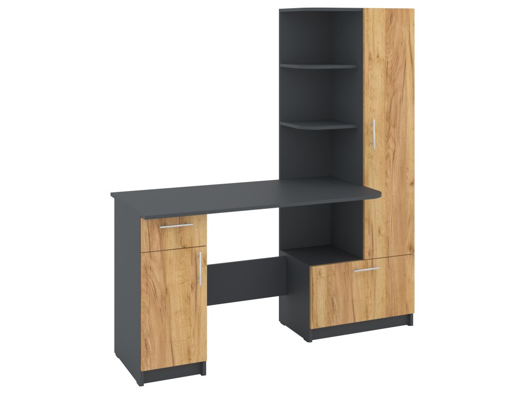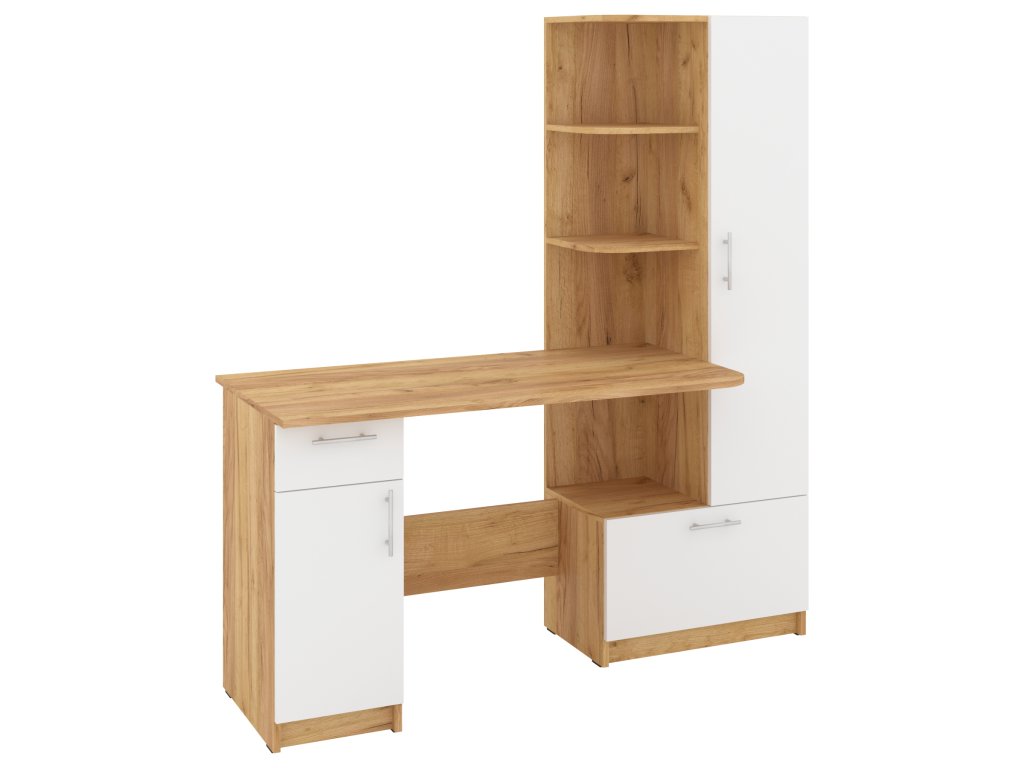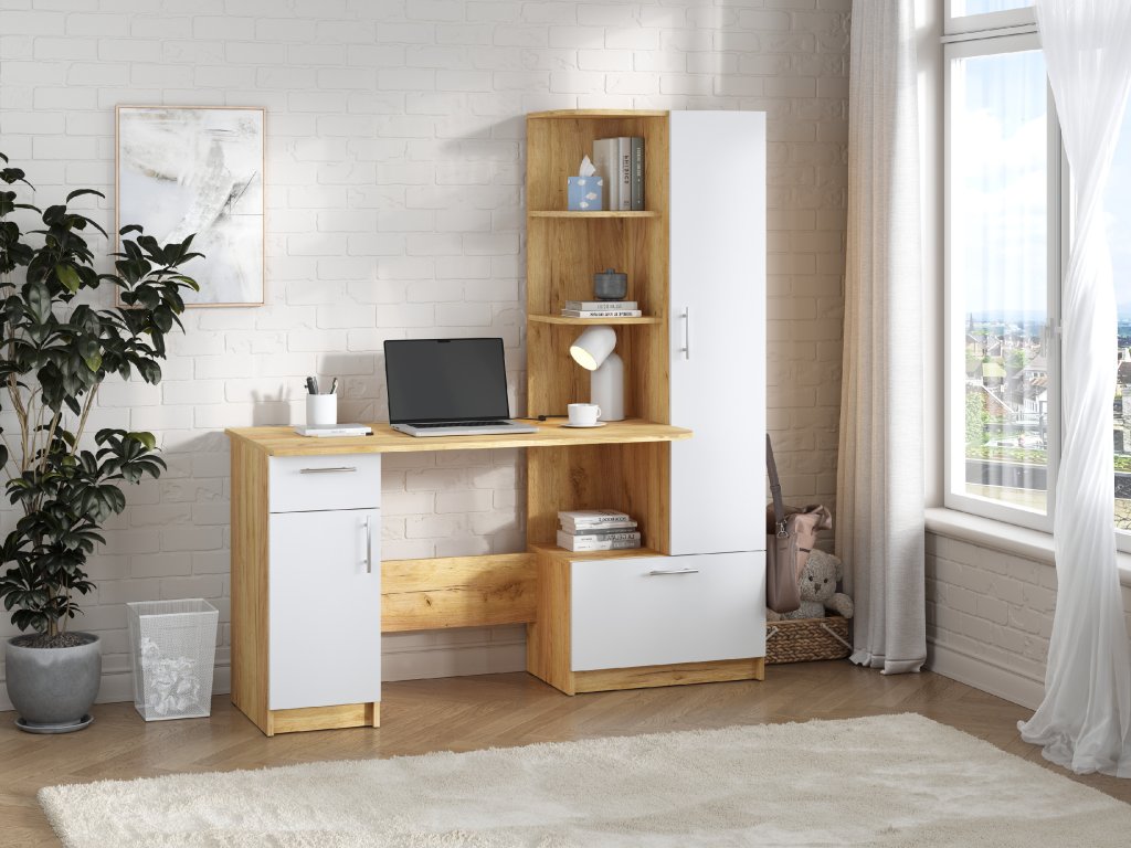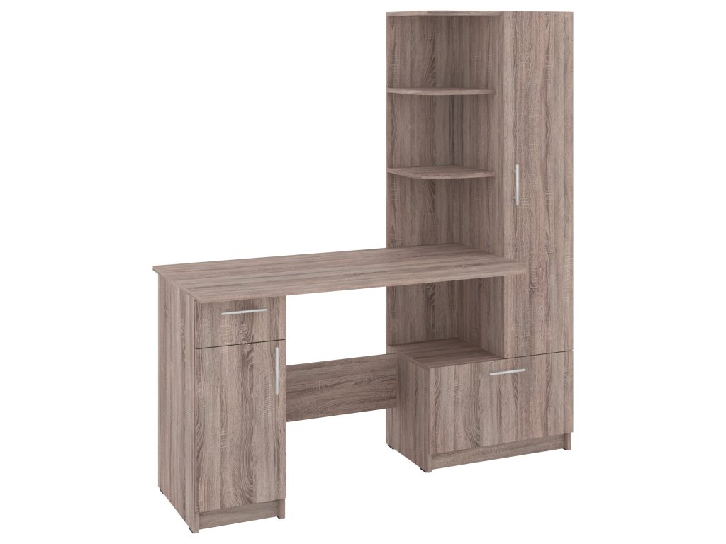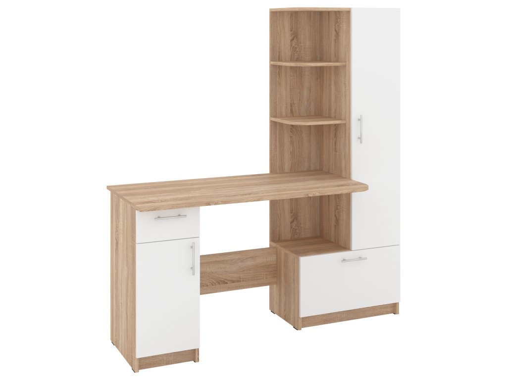 Psací stůl SANS se skříní a policovým regálem je ideálním řešením pro ty, kteří hledají kombinaci funkčnosti a stylového designu do své pracovny nebo domácí kanceláře. Tento elegantní stůl nabízí dostatek prostoru pro vaše pracovní potřeby a zároveň poskytuje úložný prostor pro dokumenty, knihy nebo kancelářské potřeby.
