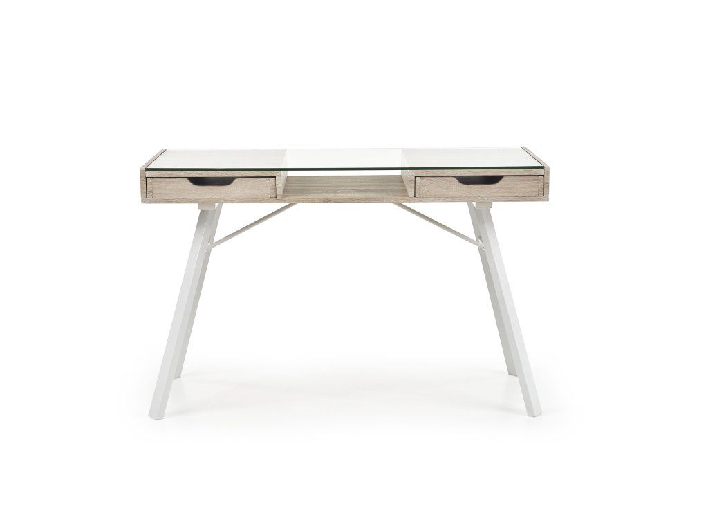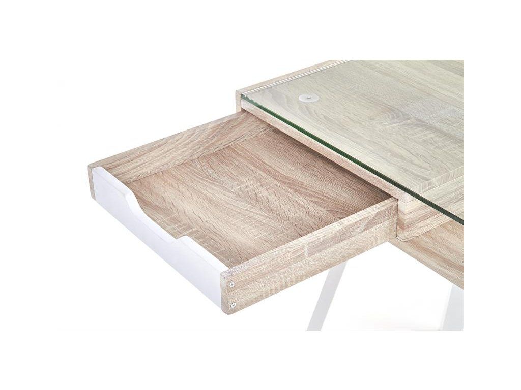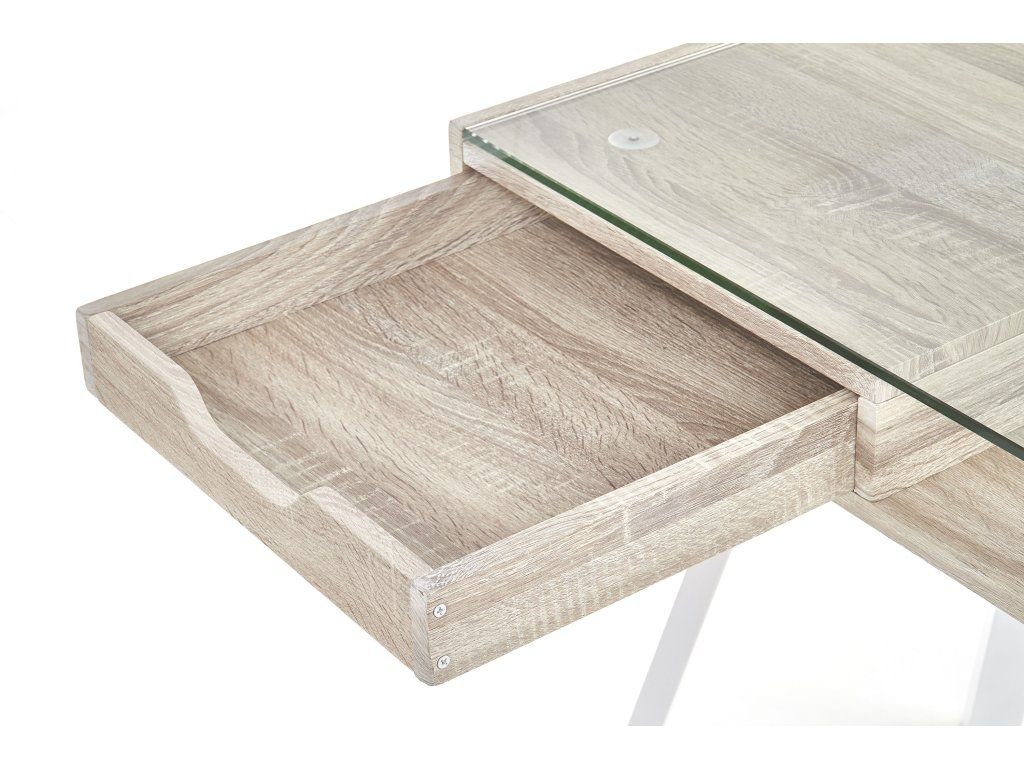 Stůl je navržen s ohledem na moderní potřeby – skleněná pracovní deska působí lehce a elegantně, zatímco pod ní se nachází funkční police a zásuvky pro uložení drobných předmětů. Kombinace laminované MDF, oceli s práškovým nástřikem a skla zajišťuje odolnost a dlouhou životnost.