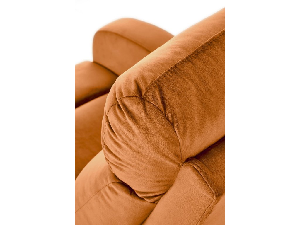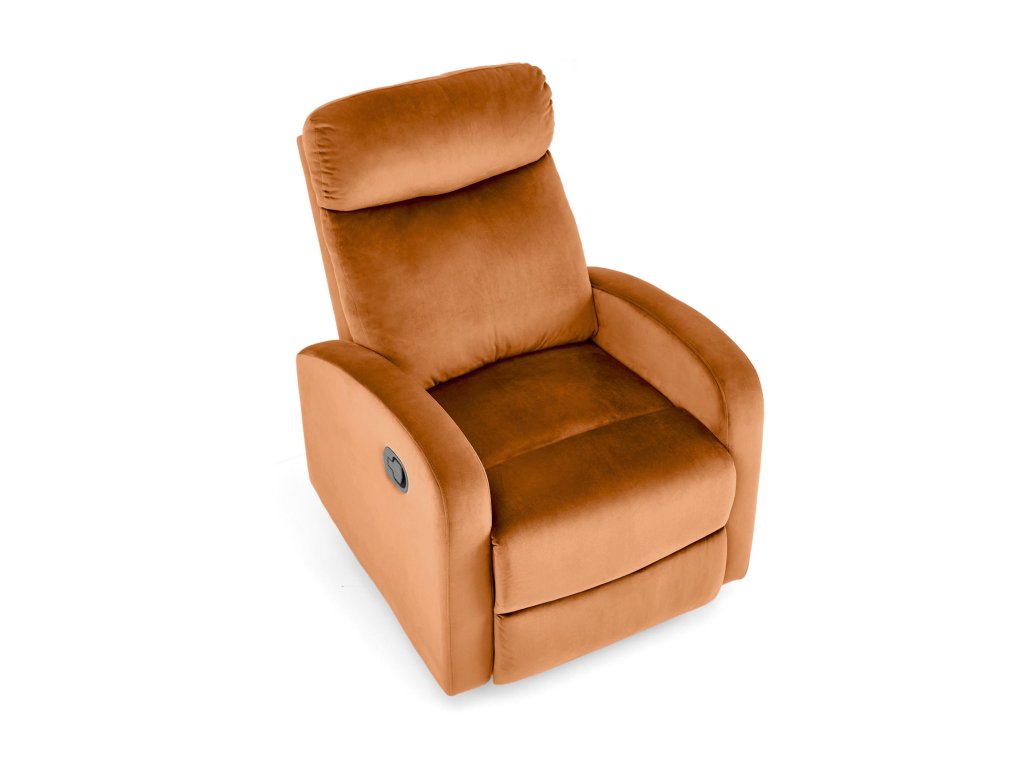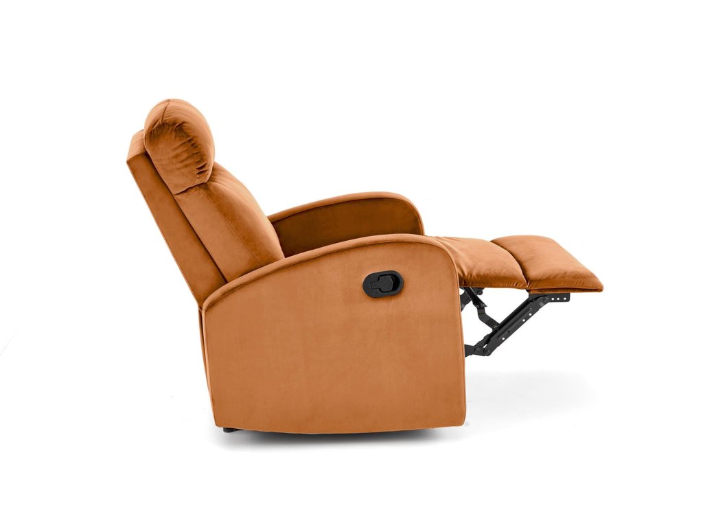 Křeslo je čalouněné měkkou sametovou látkou v nadčasové skořicové barvě, která vnáší do prostoru příjemnou atmosféru a pocit luxusu. Polstrované područky poskytují oporu rukám, což zvyšuje celkový komfort při odpočinku. Kompaktní rozměry 75 × 95–140 × 98 cm činí křeslo vhodným i do menších interiérů.
