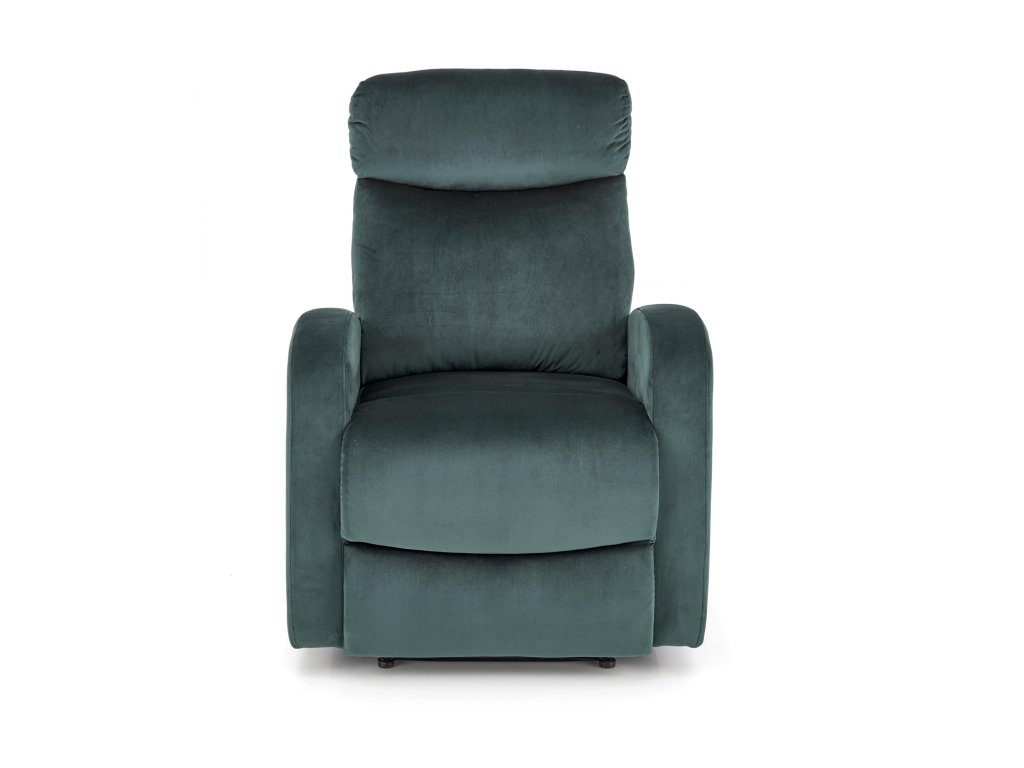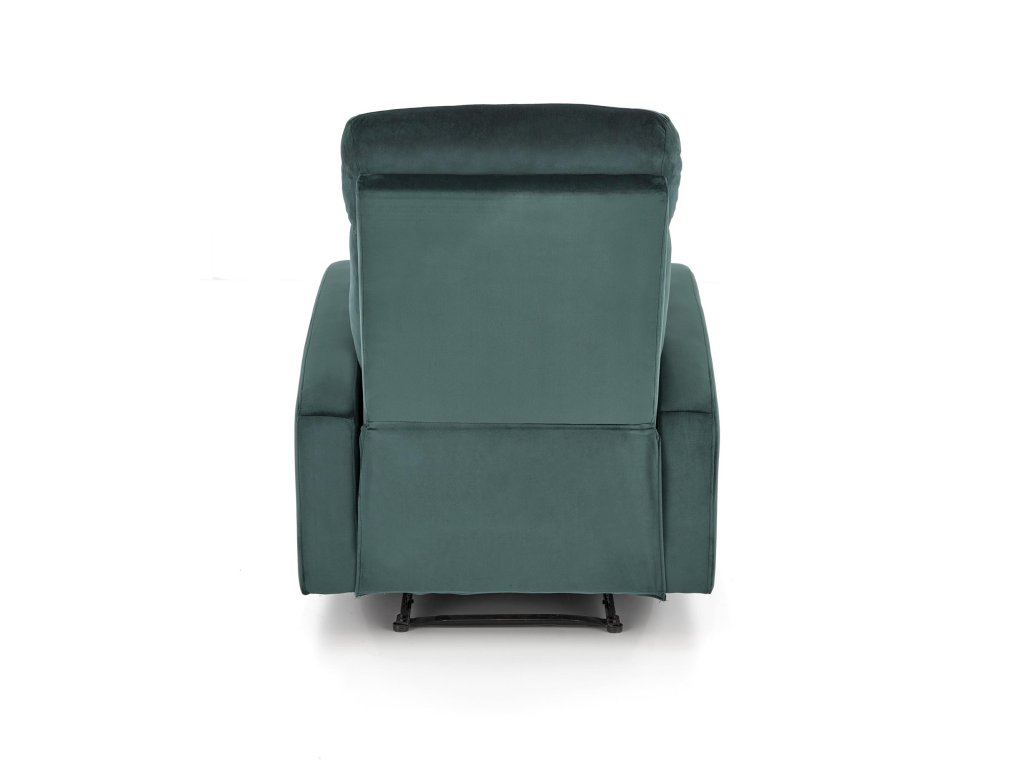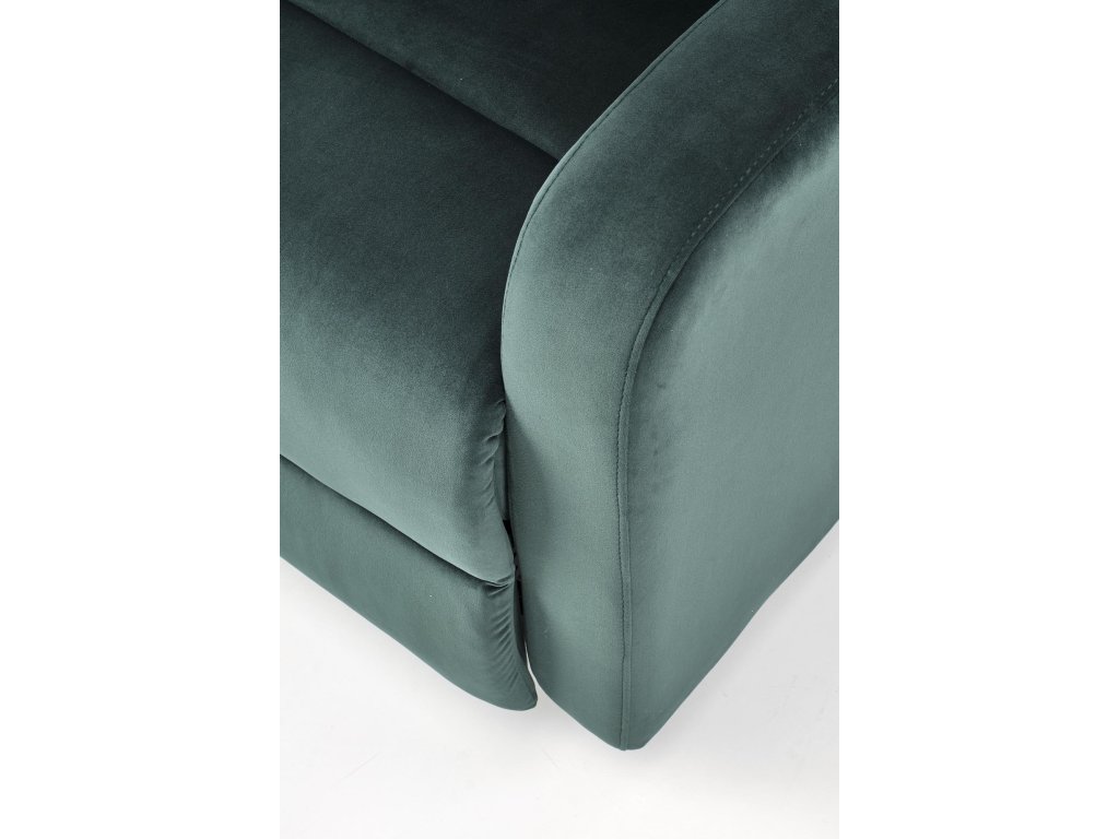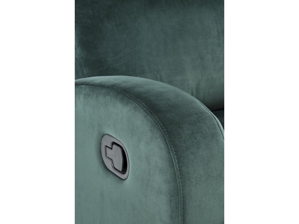 Křeslo je čalouněné měkkou sametovou látkou v nadčasové zelené barvě, která vnáší do prostoru příjemnou atmosféru a pocit luxusu. Polstrované područky poskytují oporu rukám, což zvyšuje celkový komfort při odpočinku. Kompaktní rozměry 75 × 95–140 × 98 cm činí křeslo vhodným i do menších interiérů.