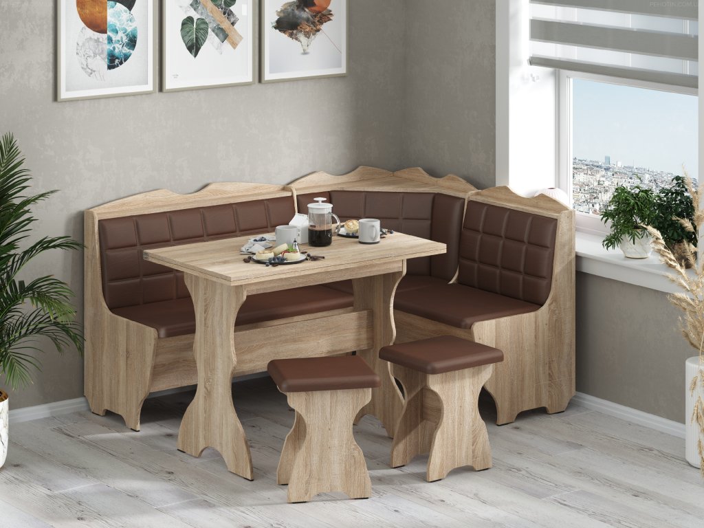 Rohová lavice FRANT SET, dub sonoma, koženka hnědá stůl a taburety v ceně
