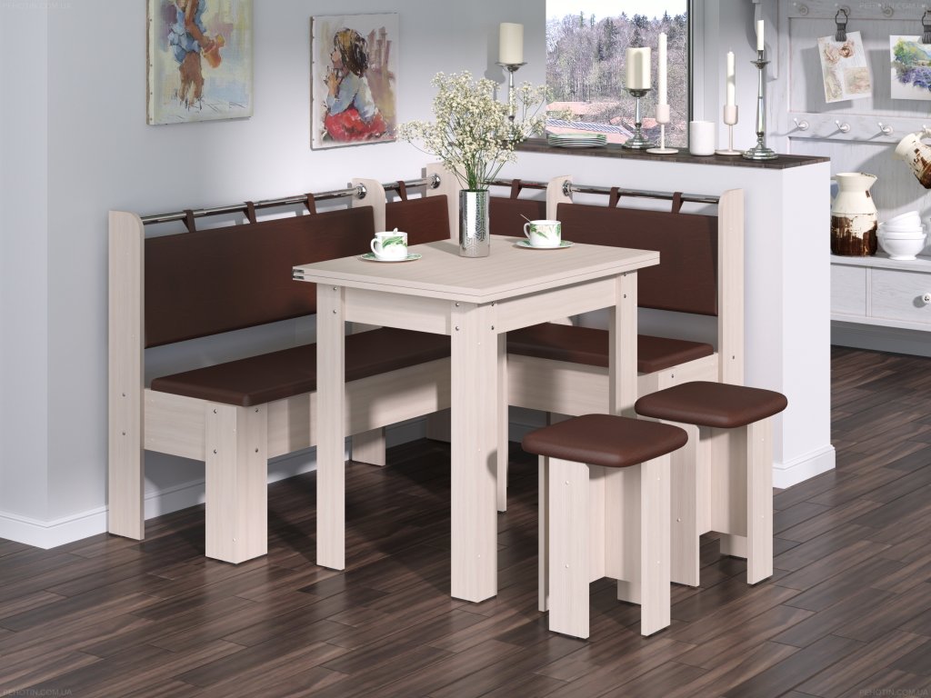 Rohová lavice HEJTMAN SET, dub sonoma, koženka hnědá stůl a taburety v ceně