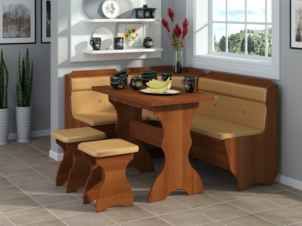 Rohová lavice KARDINAL SET, ořech světlý, koženka káva stůl a taburety v ceně