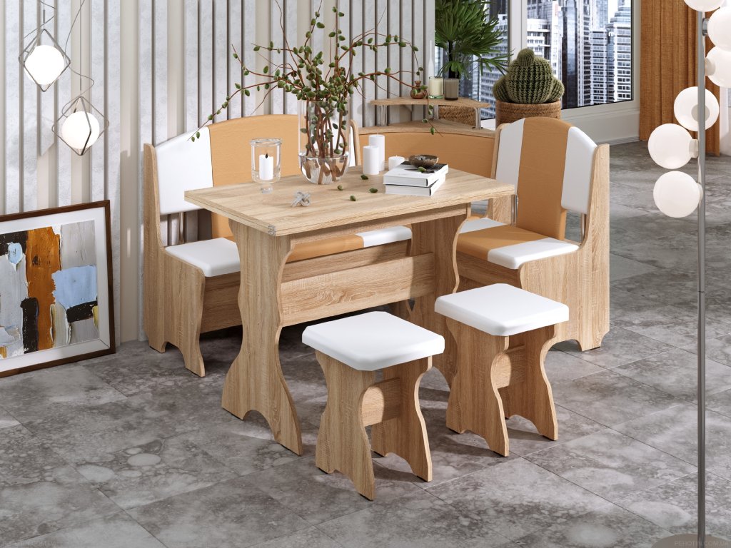 Rohová lavice KNEZ SET, dub sonoma. koženka káva + bílá stůl a taburety v ceně