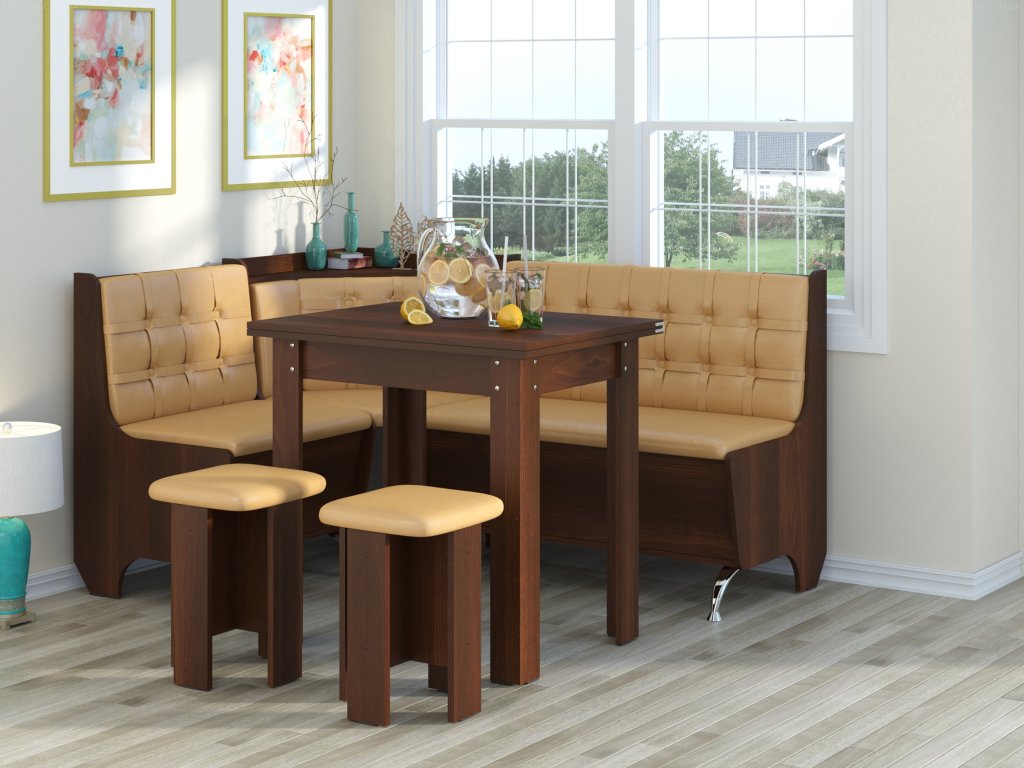 Rohová lavice MARSHAL SET, ořech tmavý, koženka káva stůl a taburety v ceně