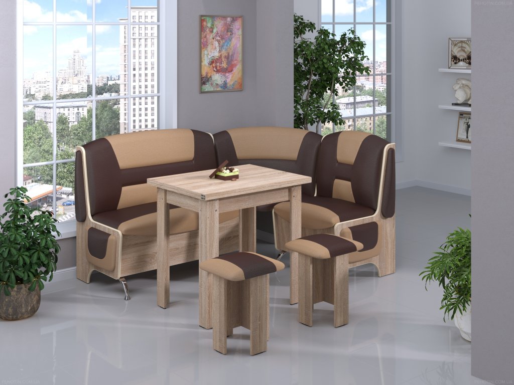 Rohová lavice SPARTAK SET, dub sonoma, koženka hnědá + káva (premium) stůl a taburety v ceně
