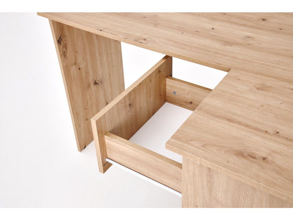Rohový psací stůl BENING v dekoru dub artisan je praktickým a stylovým řešením pro domácí kancelář, pracovnu nebo studentský pokoj. Jeho rohová konstrukce šetří místo a zároveň poskytuje velkorysý pracovní prostor. Teplý odstín dřeva v kombinaci s minimalistickým provedením působí elegantně a útulně, ideálně doplní interiéry v přírodním, industriálním i klasickém stylu.