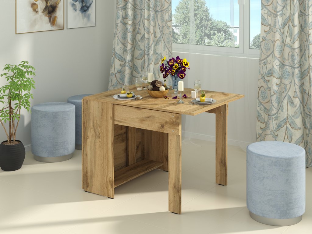 Stůl je navržen tak, aby se snadno vešel do menších prostor, což z něj činí ideální volbu do bytů, malých kuchyní nebo chalup. V případě potřeby ho jednoduše rozložíte, čímž získáte dostatečnou plochu pro pohodlné stolování.