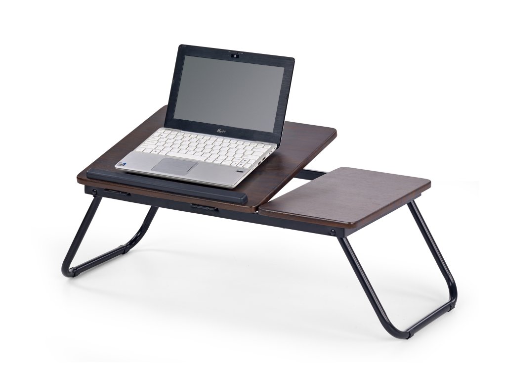 Deska stolu je rozdělena na dvě části, přičemž delší část lze naklopit až do úhlu 40°, což zabraňuje sklouznutí notebooku a zvyšuje pohodlí při práci. Stolek lze použít samostatně nebo jako nástavec k běžnému stolu. Díky malým rozměrům (60 × 34 × 23 cm) je vhodný i do menších místností či pracovních koutů. Minimalistický design v tmavém ořechu snadno doplní každý moderní interiér.