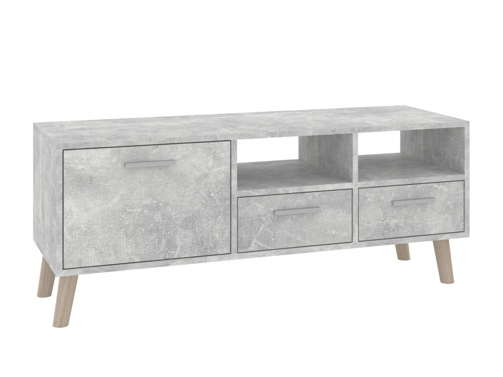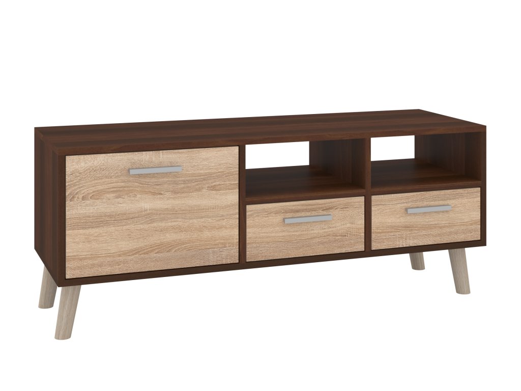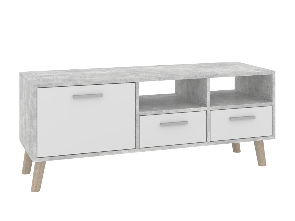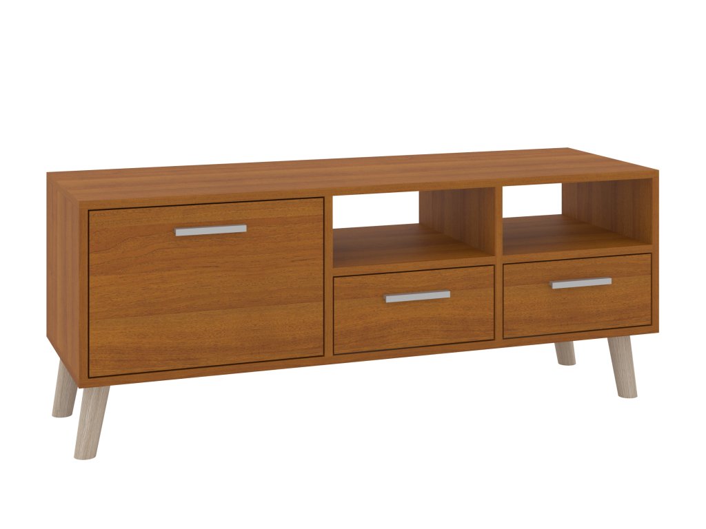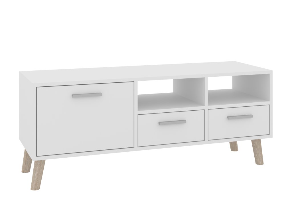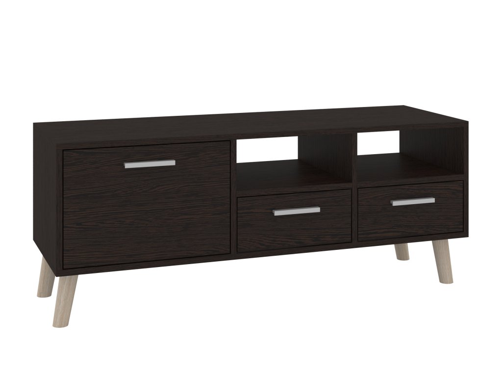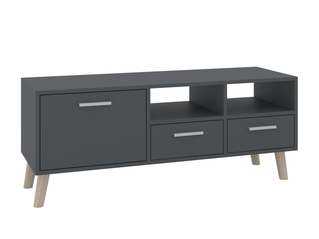 - Praktický úložný prostor: Televizní stolek je vybaven dvěma zásuvkami, dvířky a otevřenými policemi, které vám umožní přehledně uložit vše od elektroniky po dekorační předměty.