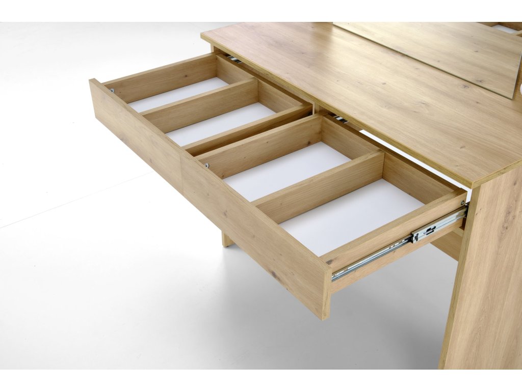 Povrch v dekoru dub artisan přináší do interiéru přírodní a teplý vzhled, který skvěle ladí s různými styly bydlení. Zpracování z kvalitní dýhované nábytkové desky zaručuje dlouhou životnost. Toaletní stolek lze v případě potřeby využít také jako psací stůl, což z něj činí praktický doplněk do ložnice, šatny nebo pracovny.
