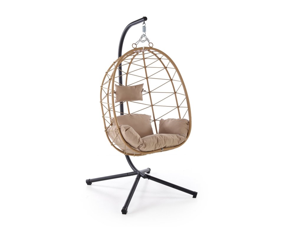 Dopřejte si luxusní odpočinek s závěsným křeslem PANCHA v přírodní barvě s béžovým sedákem a polštářem. Toto stylové houpací křeslo je skvělým doplňkem na zahradu, terasu i do interiéru.